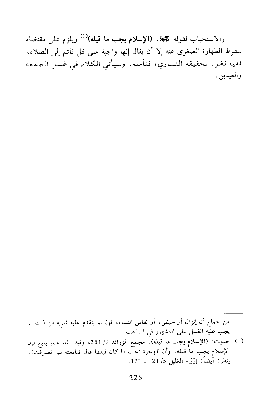 والاستحباب لقوله -عليه السلام -: (الإسلام يجب ما قبله) ويلزم على مقتضاه سقوط الطهارة الصغرى عنه إلا أن يقال إنها واجبة على كل قائم إلى الصلاة، ففيه نظر. تحقيقه التساوي، فتأمله. وسيأتي الكلام في غسل الجمعة والعيدين.