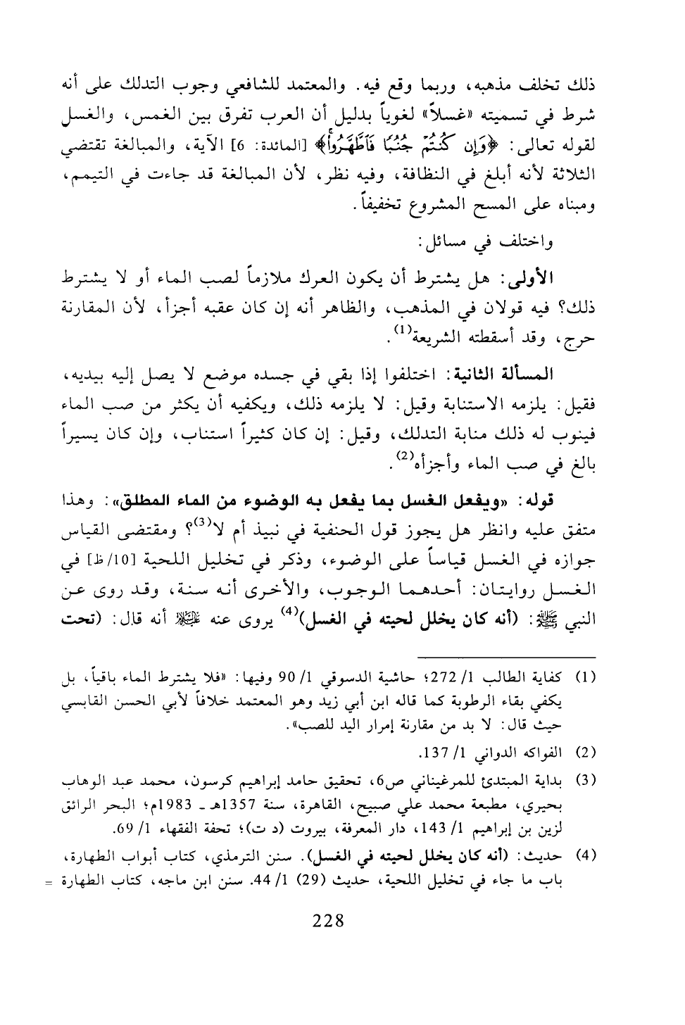 الأولى: هل يشترط أن يكون العرك ملازمًا لصب الماء أو لا يشترط ذلك؟ فيه قولان في المذهب، والظاهر أنه إن كان عقبه أجزأ، لأن المقارنة حرج، وقد أسقطته الشريعة.