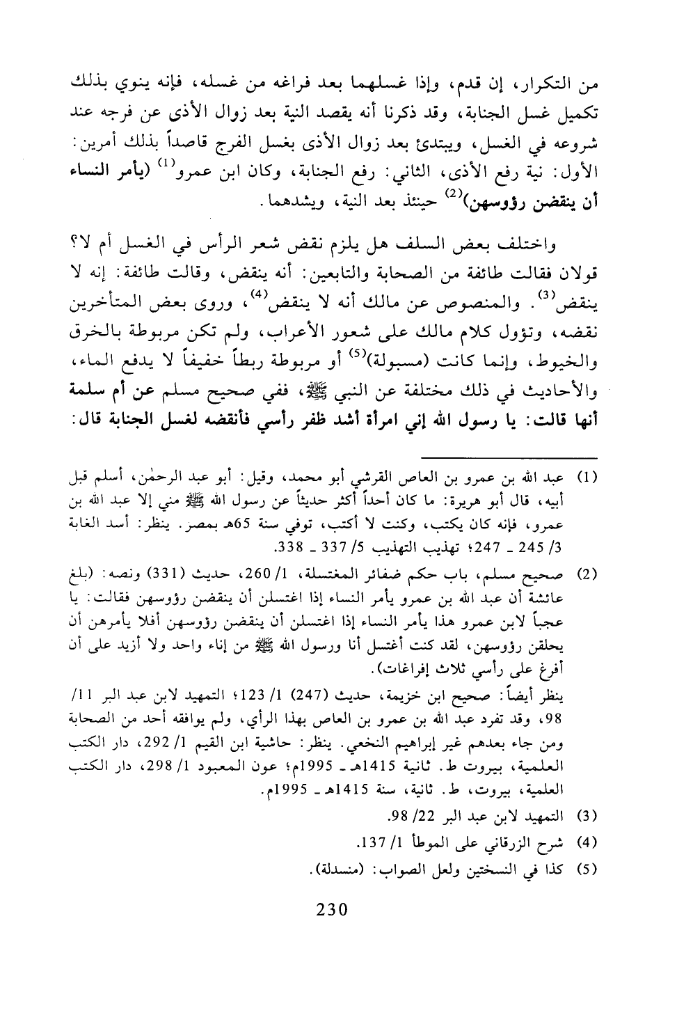 واختلف بعض السلف هل يلزم نقض شعر الرأس في الغسل أم لا؟ قولان فقالت طائفة من الصحابة والتابعين: أنه ينقض، وقالت طائفة، إنه لا ينقض. والمنصوص عن مالك أنه لا ينقض، وروى بعض المتأخرين نقضه، وتؤول كلام مالك على شعور الأعراب، ولم تكن مربوطة بالخرق والخيوط، وإنما كانت (مبسولة) أو مربوطة ربطًا خفيفًا لا يدفع الماء، والأحاديث في ذلك مختلفة عن النبي -صلى الله عليه وسلم -، ففي صحيح مسلم عن أم سلمة أنها قالت: يا رسول الله إني امرأة أشد ظفر رأسي فأنقضه لغسل الجنابة قال: