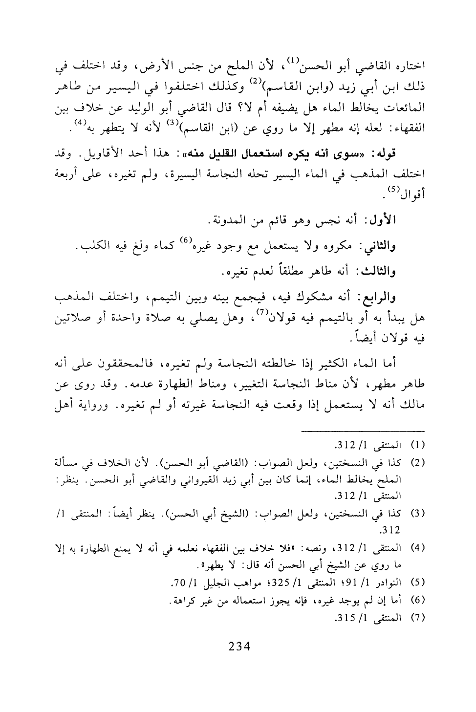 اختاره القاضي أبو الحسن، لأن الملح من جنس الأرض، وقد اختلف في ذلك ابن أبي زيد (وابن القاسم) وكذلك اختلفوا في اليسير من طاهر المائعات يخالط الماء هل يضيفه أم لا؟ قال القاضي أبو الوليد عن خلاف بين الفقهاء: لعله إنه مطهر إلا ما روي عن (ابن القاسم) لأنه لا يتطهر به.