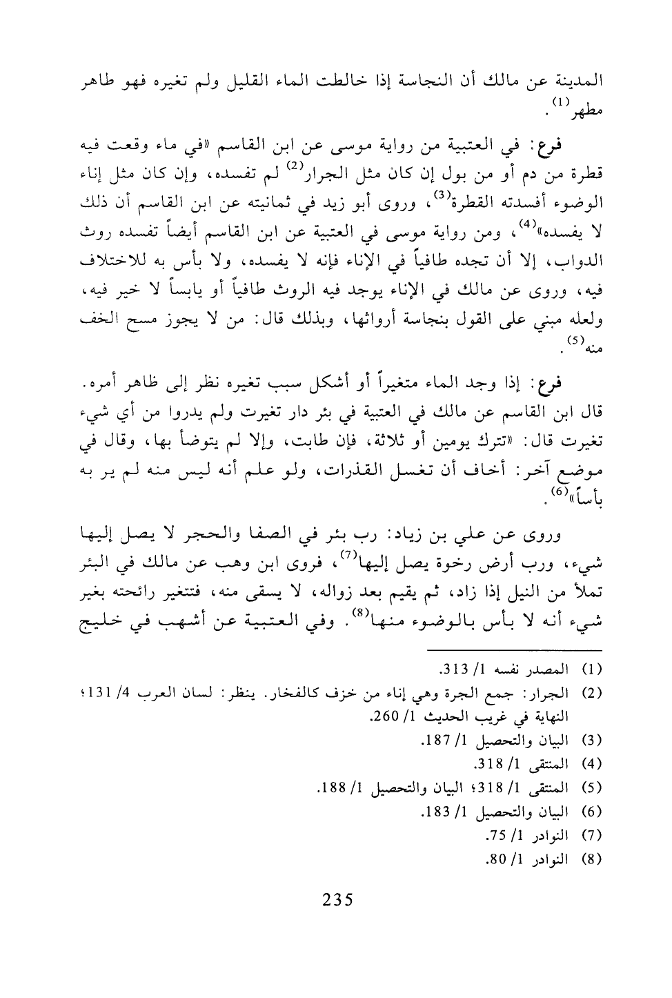 وروى عن علي بن زياد: رب بئر في الصفا والحجر لا يصل إليها شيء، ورب أرض رخوة يصل إليها، فروى ابن وهب عن مالك في البئر تملأ من النيل إذا زاد، ثم يقيم بعد زواله، لا يسقى منه، فتتغير رائحته بغير شيء أنه لا بأس بالوضوء منها. وفي العتبية عن أشهب في خليج