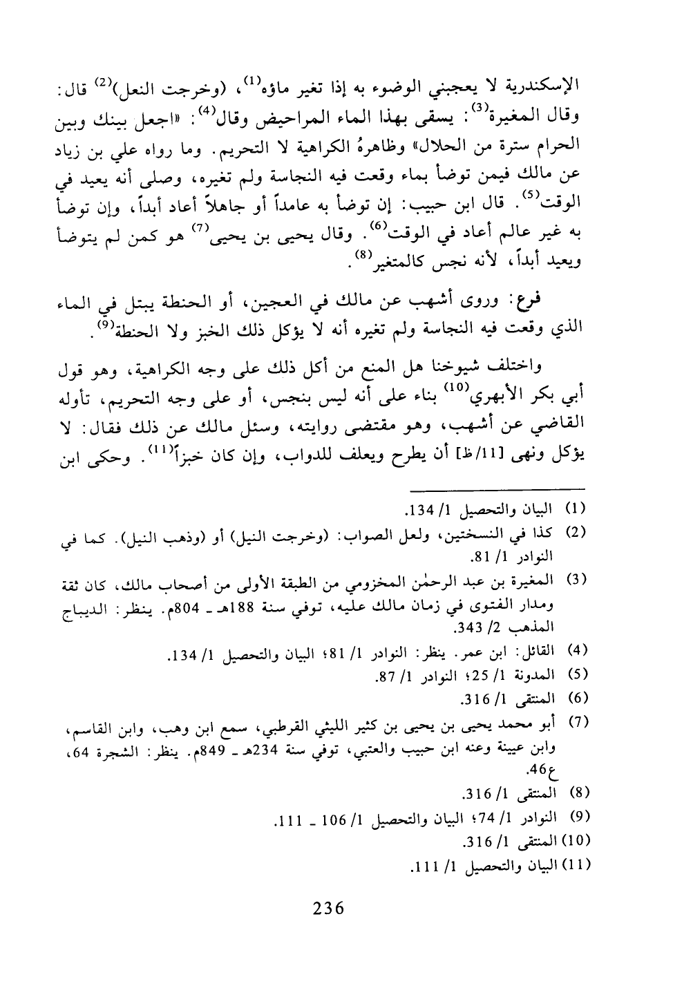 الإسكندرية لا يعجبني الوضوء به إذا تغير ماؤه، (وخرجت النعل) قال: وقال المغيرة: يسقى بهذا الماء المراحيض وقال: "اجعل بينك وبين الحرام سترة من الحلال" وظاهره الكراهية لا التحريم. وما رواه علي بن زياد عن مالك فيمن توضأ بماء وقعت فيه النجاسة ولم تغيره، وصلى أنه يعيد في الوقت. قال ابن حبيب: إن توضأ به عامدًا أو جاهلاً أعاد أبدًا، وإن توضأ به غير عالم أعاد في الوقت. وقال يحيى بن يحيى هو كمن لم يتوضأ ويعيد أبدًا، لأنه نجس كالمتغير.