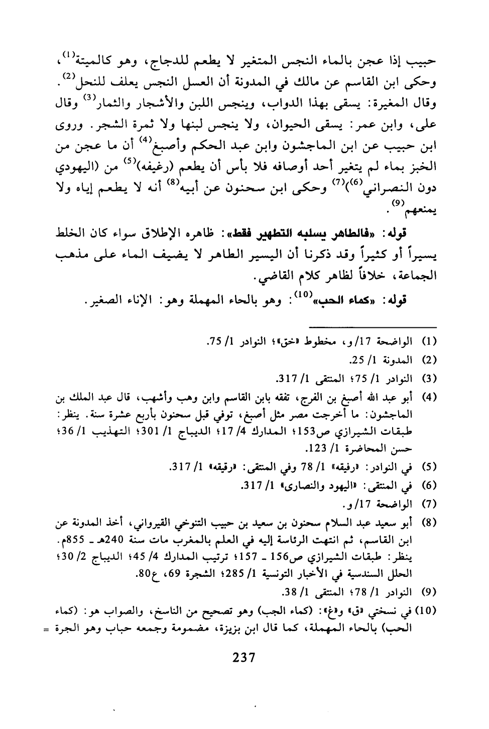 حبيب إذا عجن بالماء النجس المتغير لا يطعم للدجاج، وهو كالميتة، وحكى ابن القاسم عن مالك في المدونة أن الغسل النجس يعلف للنحل. وقال المغيرة: يسقى بهذا الدواب، وبنجس اللبن والأشجار والثمار وقال على، وابن عمر: يسقى الحيوان، ولا ينجس لبنها ولا ثمرة الشجر. وروى ابن حبيب عن ابن الماجشون وابن عبد الحكم وأصبغ أن ما عجن من الخبز بماء لم يتغير أحد أوصافه فلا بأس أن يطعم (رغيفه) من (اليهودي دون النصراني) وحكى ابن سحنون عن أبيه أنه لا يطعم إياه ولا يمنعهم.