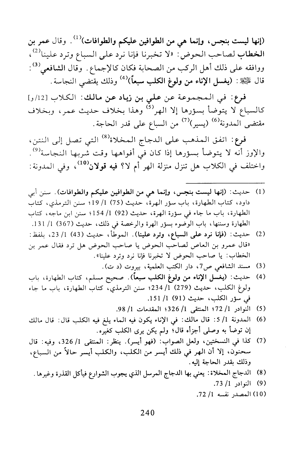 (إنها ليست بنجس، وإنما هي من الطوافين عليكم والطوافات). وقال عمر بن الخطاب لصاحب الحوض: "لا تخبرنا فإنا نرد على السباع وترد علينا، ووافقه على ذلك أهل الركب من الصحابة فكان كالإجماع. وقال الشافعي: قال -عليه السلام -: (يغسل الإناء من ولوغ الكلب سبعًا) وذلك يقتضي النجاسة.