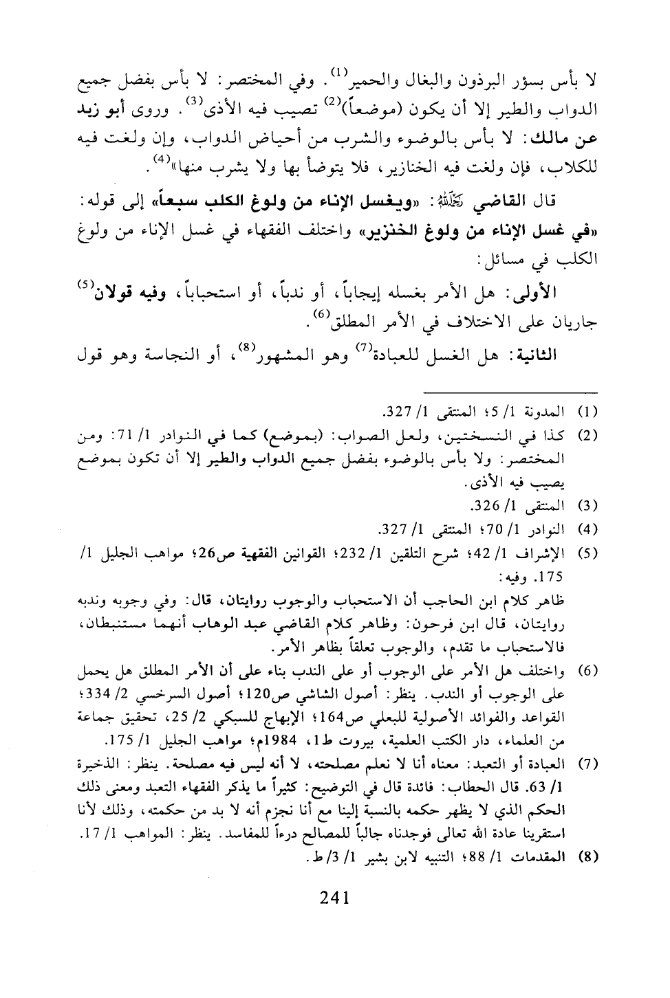 قال القاضي -رحمه الله -: "ويغسل الإناء من ولوغ الكلب سبعًا" إلى قوله: "في غسل الإناء من ولوغ الخنزير" واختلف الفقهاء في غسل الإناء من ولوغ الكلب في مسائل: