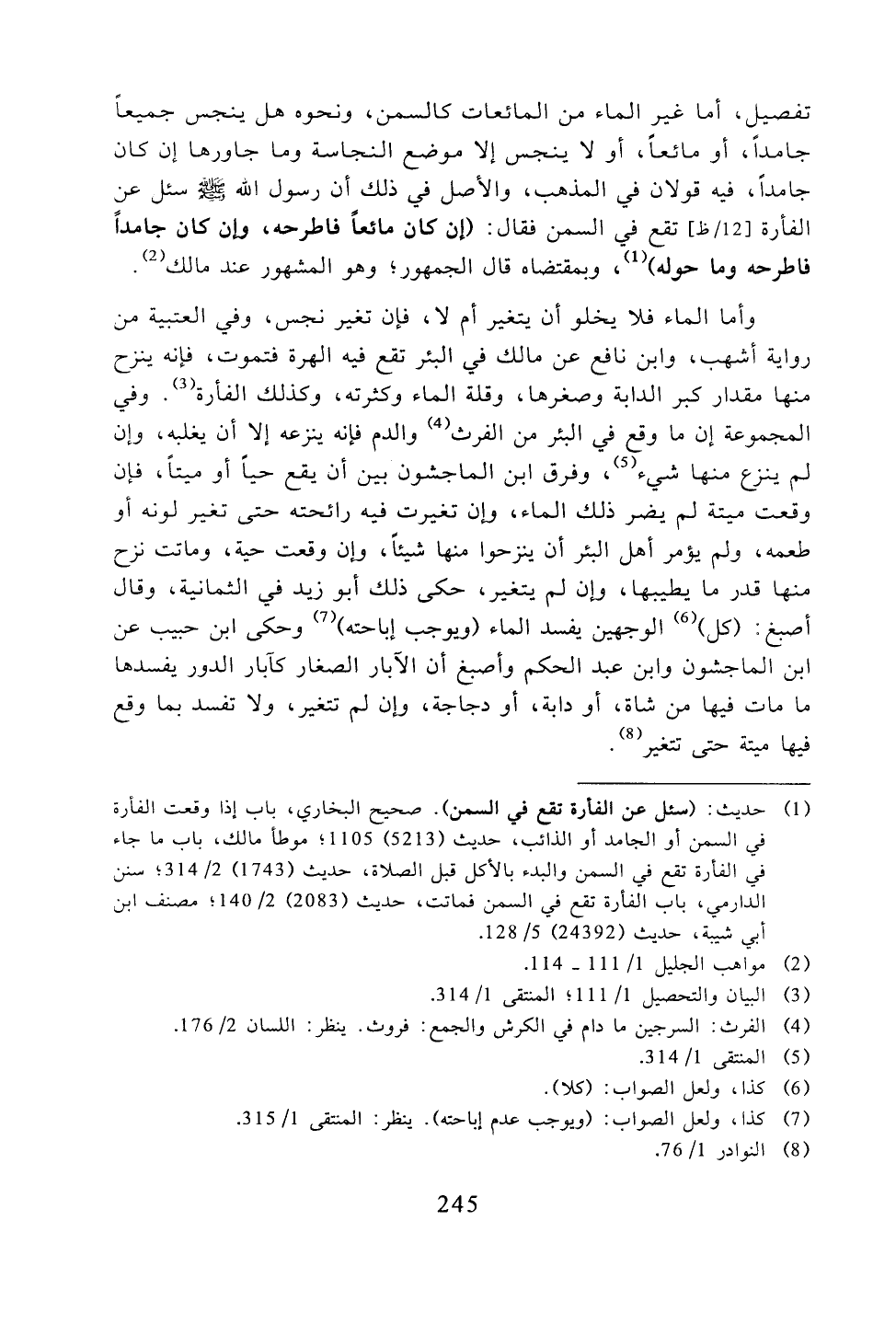 تفصيل، أما غير الماء من المائعات كالسمن، ونحوه هل ينجس جميعًا جامدًا، أو مائعًا، أو لا ينجس إلا موضع النجاسة وما جاورها إن كان جامدًا، فيه قولان في المذهب، والأصل في ذلك أن رسول الله -صلى الله عليه وسلم -سئل عن الفأرة تقع في السمن فقال: (إن كان مائعًا فاطرحه، وإن كان جامدًا فاطرحه وما حوله)، وبمقتضاه قال الجمهور؛ وهو المشهور عند مالك.
