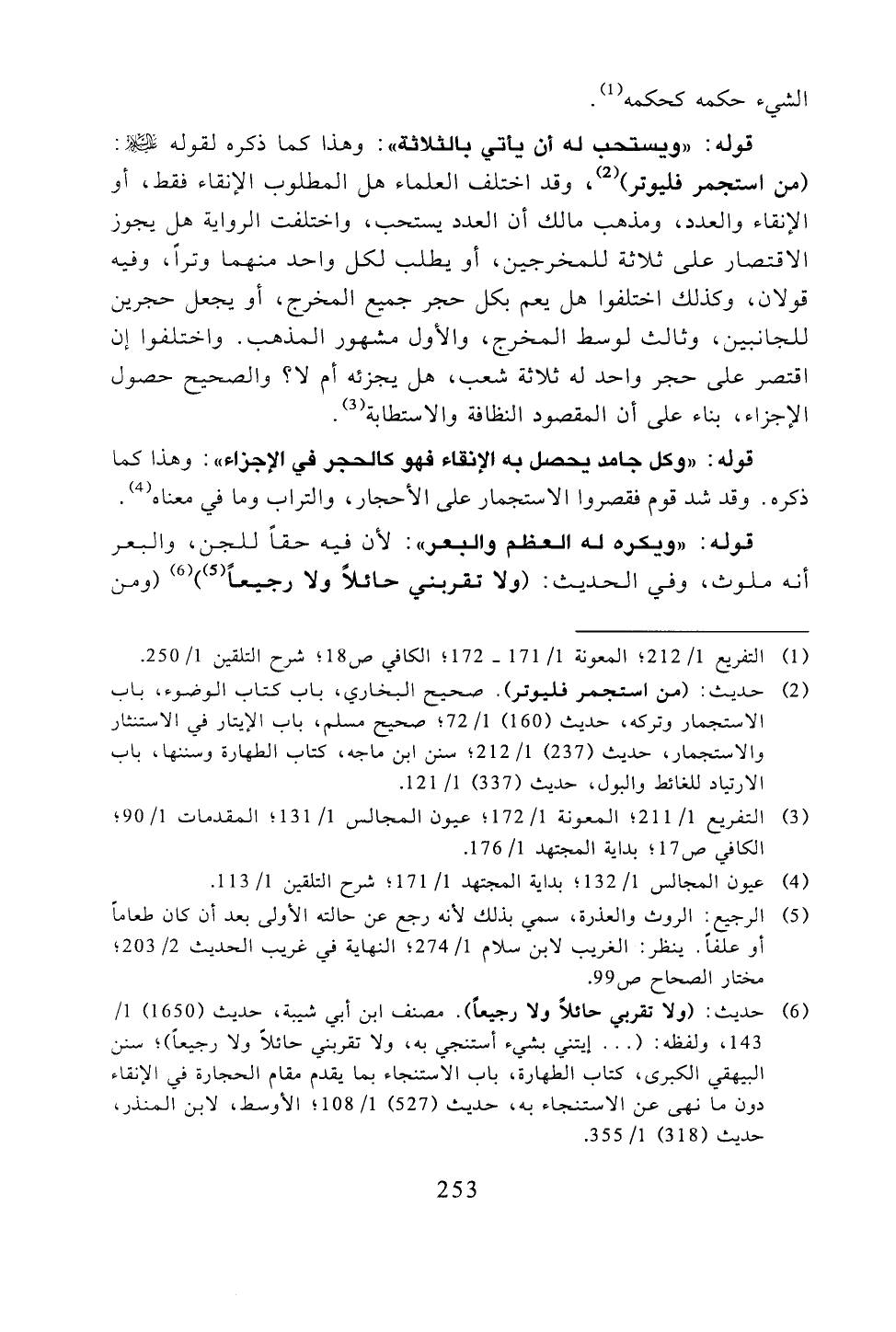 قوله: "ويستحب له أن يأتي بالثلاثة": وهذا كما ذكره لقوله -عليه السلام -: (من استجمر فليوتر)، وقد اختلف العلماء هل المطلوب الإنقاء فقط، أو الإنقاء والعدد، ومذهب مالك أن العدد يستحب، واختلفت الرواية هل يجوز الاقتصار على ثلاثة للمخرجين، أو يطلب لكل واحد منهما وترًا، وفيه قولان، وكذلك اختلفوا هل يعم بكل حجر جميع المخرج، أو يجعل حجرين للجانبين، وثالث لوسط المخرج، والأول مشهور المذهب. واختلفوا إن اقتصر على حجر واحد له ثلاثة شعب، هل يجزئه أم لا؟ والصحيح حصول الإجزاء، بناء على أن المقصود النظافة والاستطابة.