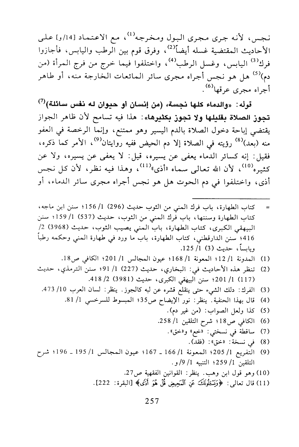 قوله: "والدماء كلها نجسة، (من إنسان أو حيوان له نفس سائلة) تجوز الصلاة بقليلها ولا تجوز بكثيرها": هذا فيه تسامح لأن ظاهر الجواز يقتضي إباحة دخول الصلاة بالدم اليسير وهو ممتنع، وإنما الرخصة في العفو منه (بعد) رؤيته في الصلاة إلا دم الحيض ففيه روايتان، الأمر كما ذكره، فقيل: إنه كسائر الدماء يعفى عن يسيره، قيل: لا يعفى عن يسيره، ولا عن كثيره، لأن الله تعالى سماه "أذى"، وهذا فيه نظر، لأن كل نجس أذى، واختلفوا في دم الحوت هل هو نجس أجراه مجرى سائر الدماء، أو