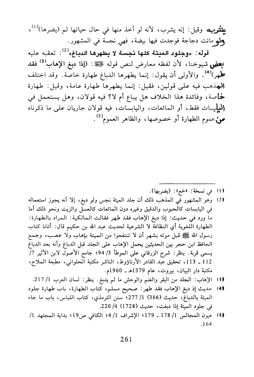 تعقَّبه عليه بعض شيوخنا؛ لأن لفظه معارِض لنص قوله -عليه السلام-: (إذا دُبغ الإهاب فقد طهر). والأولى أن يقول: إنما يطهرها الدباغ طهارة خاصة.