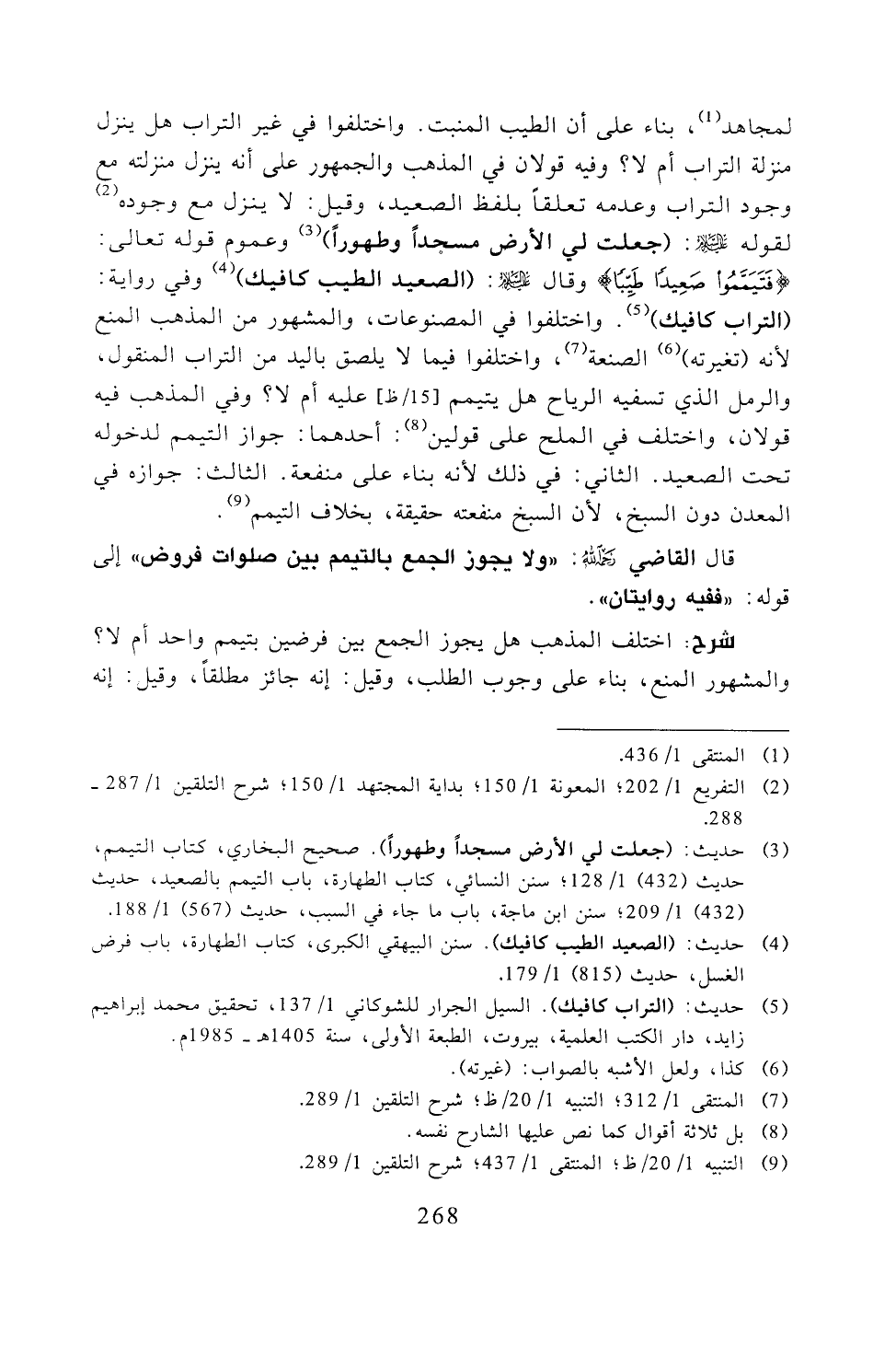 لمجاهد، بناء على أن الطيب المنبت. واختلفوا في غير التراب هل ينزل منزلة التراب أم لا؟ وفيه قولان في المذهب والجمهور على أنه ينزل منزلته مع وجود التراب وعدمه تعلقًا بلفظ الصعيد، وقيل: لا ينزل مع وجوده لقوله -عليه السلام -: (جعلت لي الأرض مسجدًا وطهورًا) وعموم قوله تعالى: {فتيمموا صعيدًا طيبًا} وقال -عليه السلام -: (الصعيد الطيب كافيك) وفي رواية: (التراب كافيك). واختلفوا في المصنوعات، والمشهور من المذهب المنع لأنه (تغيرته) الصنعة، واختلفوا فيما لا يلصق باليد من التراب المنقول، والرمل الذي تسفيه الرياح هل يتيمم عليه أم لا؟ وفي المذهب فيه قولان، واختلف في الملح على قولين: أحدهما: جواز التيمم لدخوله تحت الصعيد. الثاني: في ذلك لأنه بناء على منفعة. الثالث: جوازه في المعدن دون السبخ، لأن السبخ منفعته حقيقة، بخلاف التيمم.