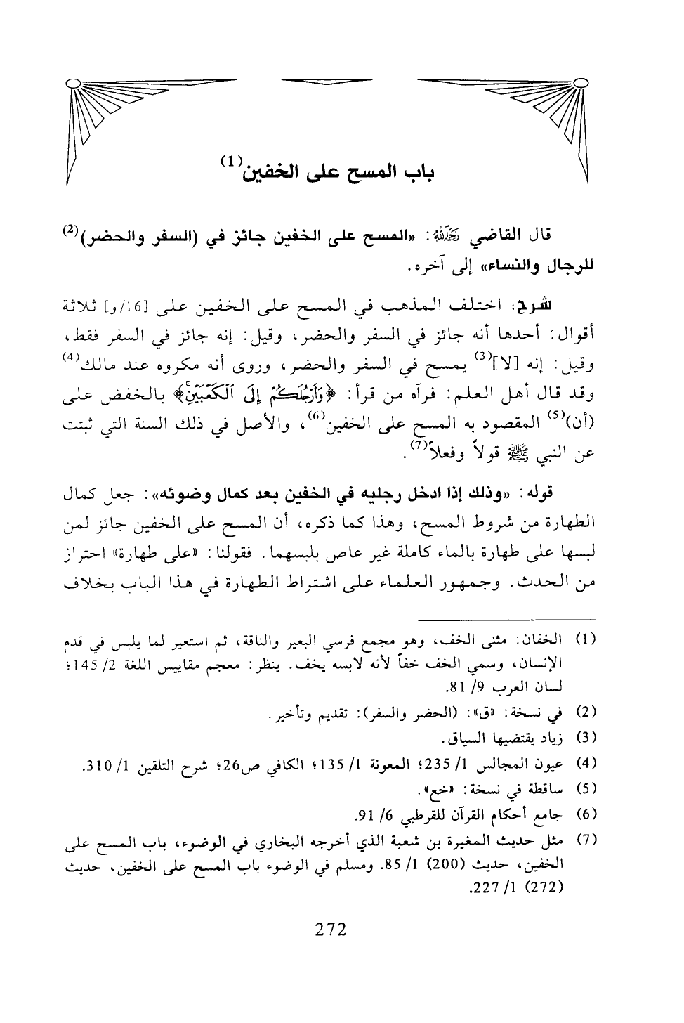شرح: اختلف المذهب في المسح على الخفين على ثلاثة أقوال: أحدها أنه جائز في السفر والحضر، وقيل: إنه جائز في السفر فقط، وقيل: إنه [لا] يمسح في السفر والحضر، وروى أنه مكروه عند مالك وقد قال أهل العلم: فرآه من قرأ: {وأرجلكم إلى الكعبين} بالخفض على (أن) المقصود به المسح على الخفين، والأصل في ذلك السنة التي ثبتت عن النبي -صلى الله عليه وسلم -قولاً وفعلاً.