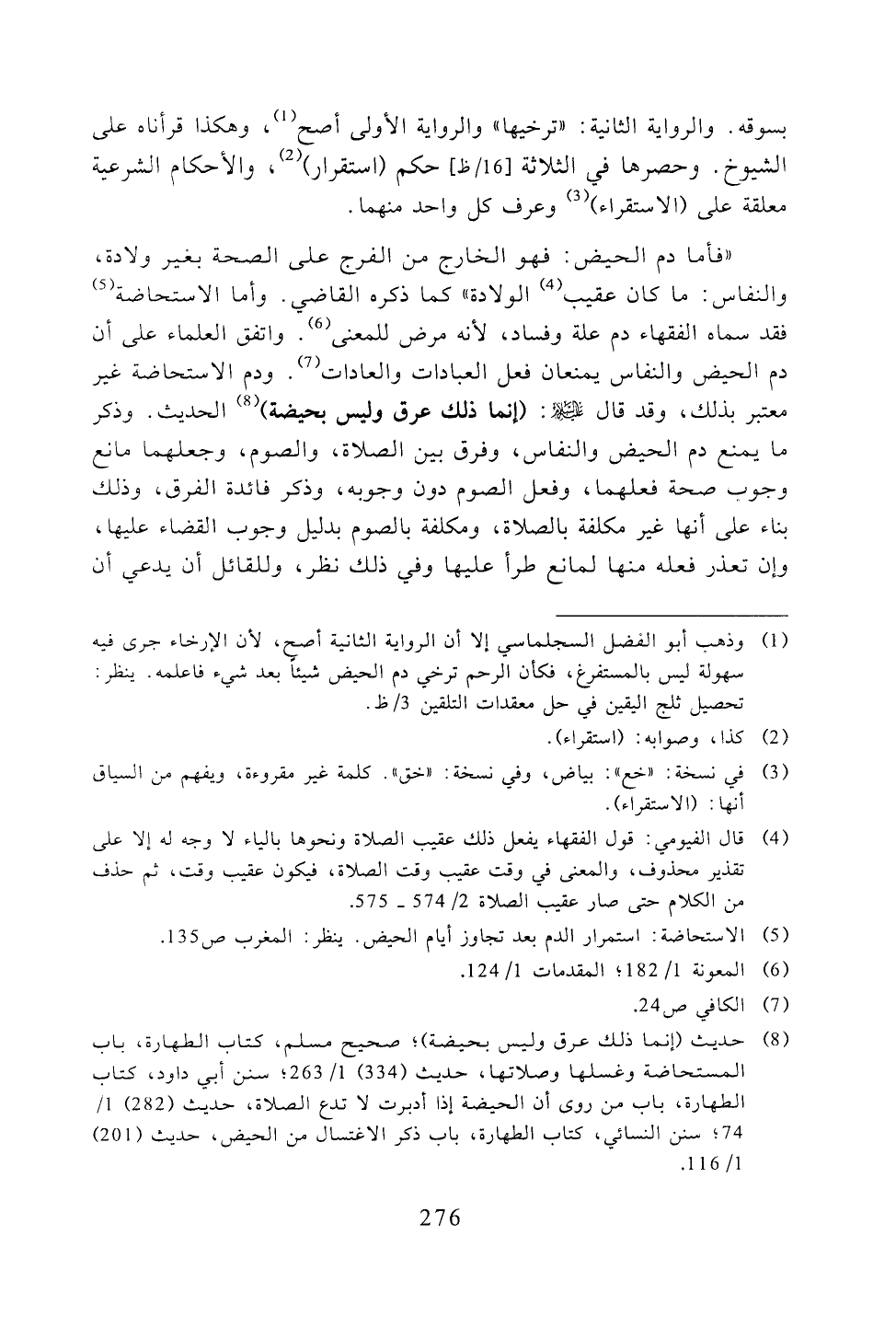 "فأما دم الحيض: فهو الخارج من الفرج على الصحة بغير ولادة، والنفاس: ما كان عقيب الولادة" كما ذكره القاضي. وأما الاستحاضة فقد سماه الفقهاء دم علة وفساد، لأنه مرض للمعنى. واتفق العلماء على أن دم الحيض والنفاس يمنعان فعل العبادات والعادات. ودم الاستحاضة غير معتبر بذلك، وقد قال -عليه السلام -: (إنما ذلك عرق وليس بحيضة) الحديث. وذكر ما يمنع دم الحيض والنفاس، وفرق بين الصلاة، والصوم، وجعلهما مانع وجوب صحة فعلهما، وفعل الصوم دون وجوبه، وذكر فائدة الفرق، وذلك بناء على أنها غير مكلفة بالصلاة، ومكلفة بالصوم بدليل وجوب القضاء عليها، وإن تعذر فعله منها لمانع طرأ عليها وفي ذلك نظر، وللقائل أن يدعي أن