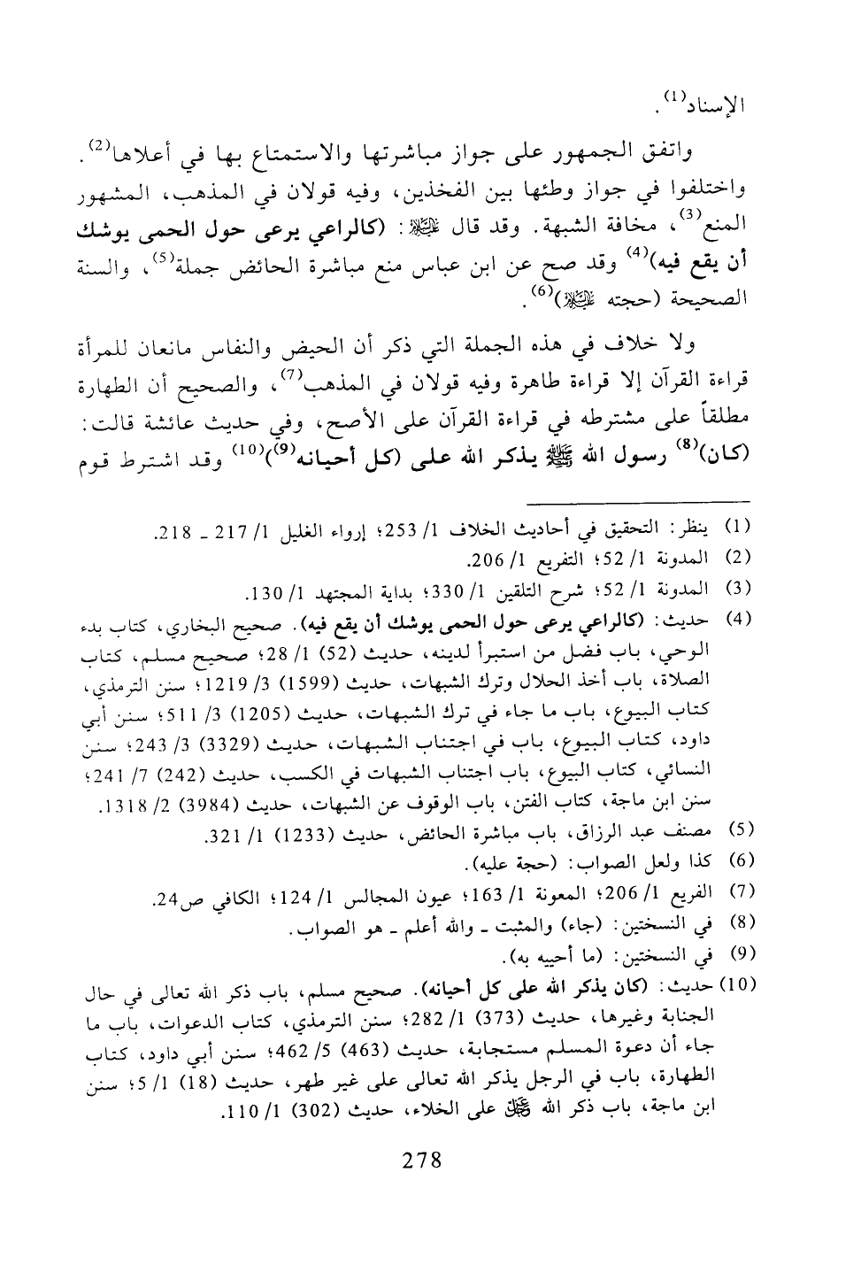 واتفق الجمهور على جواز مباشرتها والاستمتاع بها في أعلاها. واختلفوا في جواز وطئها بين الفخذين، وفيه قولان في المذهب، المشهور المنع، مخافة الشبهة. وقد قال -عليه السلام -: (كالراعي يرعى حول الحمى يوشك أن يقع فيه) وقد صح عن ابن عباس منع مباشرة الحائض جملة، والسنة الصحيحة (حجته -عليه السلام -).