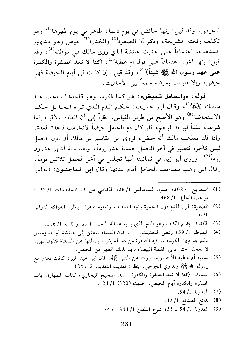 الحيض، وقد قيل: إنها حائض في يوم دمها، طاهر في يوم طهرها وهو تكلف رفعته الشريعة، وذكر أن الصفرة والكدرة حيض وهو مشهور المذهب، اعتمادًا على حديث عائشة الذي روى مالك في موطئه، وقد قيل: إنها لغو، اعتمادًا على قول أم عطية: (كنا لا نعد الصفرة والكدرة على عهد رسول الله -صلى الله عليه وسلم -شيئًا)، وقد قيل: إن كانت في أيام الحيضة فهي حيض، وإلا فليست بحيضة جمعا بين الأحاديث.