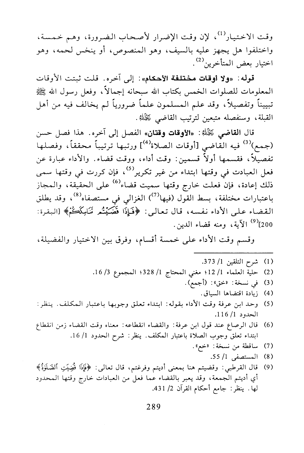 قال القاضي -رحمه الله -: "الأوقات وقتان" الفصل إلى آخره. هذا فصل حسن (جمع) فيه القاضي [أوقات الصلاة] ورتبها ترتيبًا محققًا، وفصلها تفصيلاً، فقسمها أولاً قسمين: وقت أداء، ووقت قضاء. والأداء عبارة عن فعل العبادت في وقتها ابتداء من غير تكرير، فإن كررت في وقتها سمى ذلك إعادة، فإن فعلت خارج وقتها سميت قضاء على الحقيقة، والمجاز باعتبارات مختلفة، بسط القول (فيها) الغزالي في مستصفاه، وقد يطلق القضاء على الأداء نفسه، قال تعالى: {فإذا قضيتم مناسككم} [البقرة: 200] الآية، ومنه قضاء الدين.