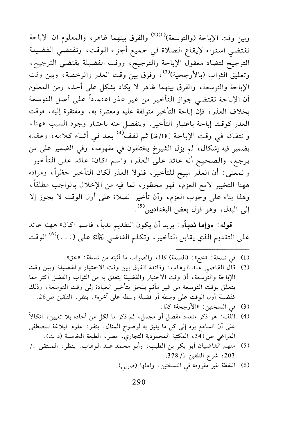 وبين وقت الإباحة (والتوسعة) والفرق بينهما ظاهر، والمعلوم أن الإباحة تقتضي استواء لإيقاع الصلاة في جميع أجزاء الوقت، وتقتضي الفضيلة الترجيح لتضاد معقول الإباحة والترجيح، ووقت الفضيلة يقتضي الترجيح، وتعليق الثواب (بالأرجحية)، وفرق بين وقت العذر والرخصة، وبين وقت الإباحة والتوسعة، والفرق بينهما ظاهر لا يكاد يشكل على أحد، ومن المعلوم أن الإباحة تقتضي جواز التأخير من غير عذر اعتمادًا على أصل التوسعة بخلاف العذر، فإن إباحة التأخير متوقفة عليه ومعتبرة به، ومفتقرة إليه، فوقت العذر كوقت إباحة باعتبار التأخير. وينفصل عنه باعتبار وجود السبب ههنا، وانتفائه في وقت الإباحة ثم لفف بعد في أثناء كلامه، وعقده بضمير فيه إشكال، لم يزل الشيوخ يختلفون في مفهومه، وفي الضمير على من يرجع، والصحيح أنه عائد على العذر، واسم "كان" عائد على التأخير. والمعنى: أن العذر مبيح للتأخير، فلولا العذر لكان التأخير حظرًا، ومراده ههنا التخيير لا مع العزم، فهو محظور، لما فيه من الإخلال بالواجب مطلقًا، وهذا بناء على وجوب العزم، وأن تأخير الصلاة على أول الوقت لا يجوز إلا إلى البدل، وهو قول بعضِ البغداديين.