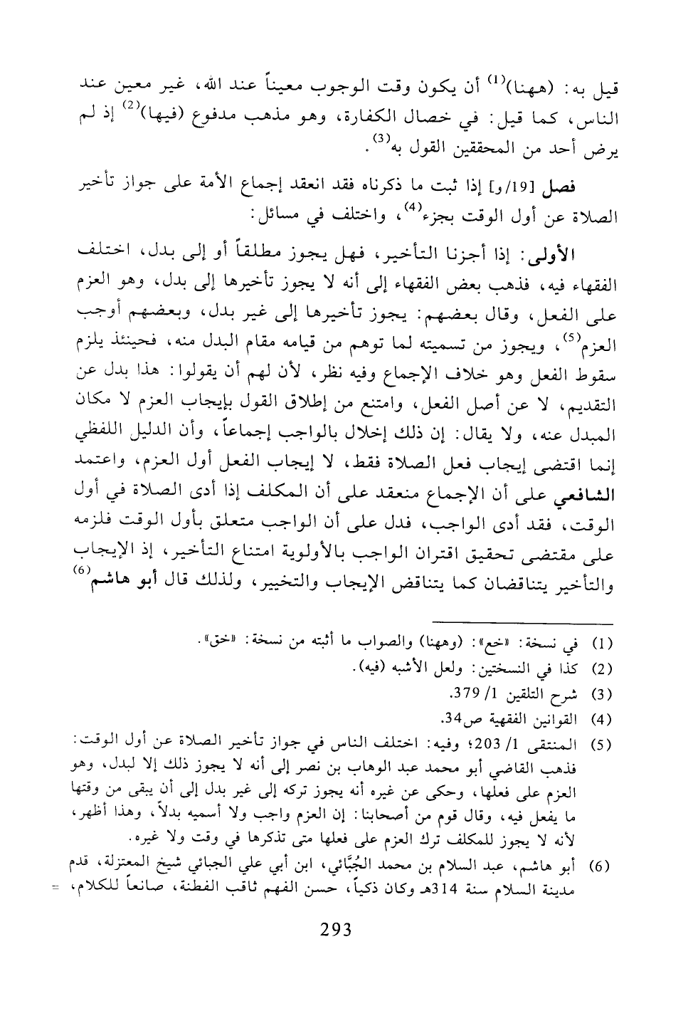 الأولى: إذا أجرنا التأخير، فهل يجوز مطلقًا أو إلى بدل، اختلف الفقهاء فيه، فذهب بعض الفقهاء إلى أنه لا يجوز تأخيرها إلى بدل، وهو العزم على الفعل، وقال بعضهم: يجوز تأخيرها إلى غير بدل، وهو العزم على الفعل، وقال بعضهم: يجوز تأخيرها إلى غير بدل، وبعضهم أوجب العزم، ويجوز ن تسميته لما توهم من قيامه مقام البدل منه، فحينئذ يلزم سقوط الفعل وهو خلاف الإجماع وفيه نظر، لأن لهم أن يقولوا: هذا بدل عن التقديم، لا عن أصل الفعل، وامتنع من إطلاق القول بإيجاب العزم لا مكان المبدل عنه، ولا يقال: إن ذلك إخلال بالواجب إجماعًا، وأن الدليل اللفظي إنما اقتضى إيجاب فعل الصلاة فقط، لا إيجاب الفعل أول العزم، واعتمد الشافعي على أن الإجماع منعقد على أن المكلف إذا أدى الصلاة في أول الوقت، فقد أدى الواجب، فدل على أن الواجب متعلق بأول الوقت فلزمه على مقتضى تحقيق اقتران الواجب بالأولوية امتناع التأخير، إذ الإيجاب والتأخير يتناقضان كما يتناقض الإيجاب والتخيير، ولذلك قال أبو هاشم