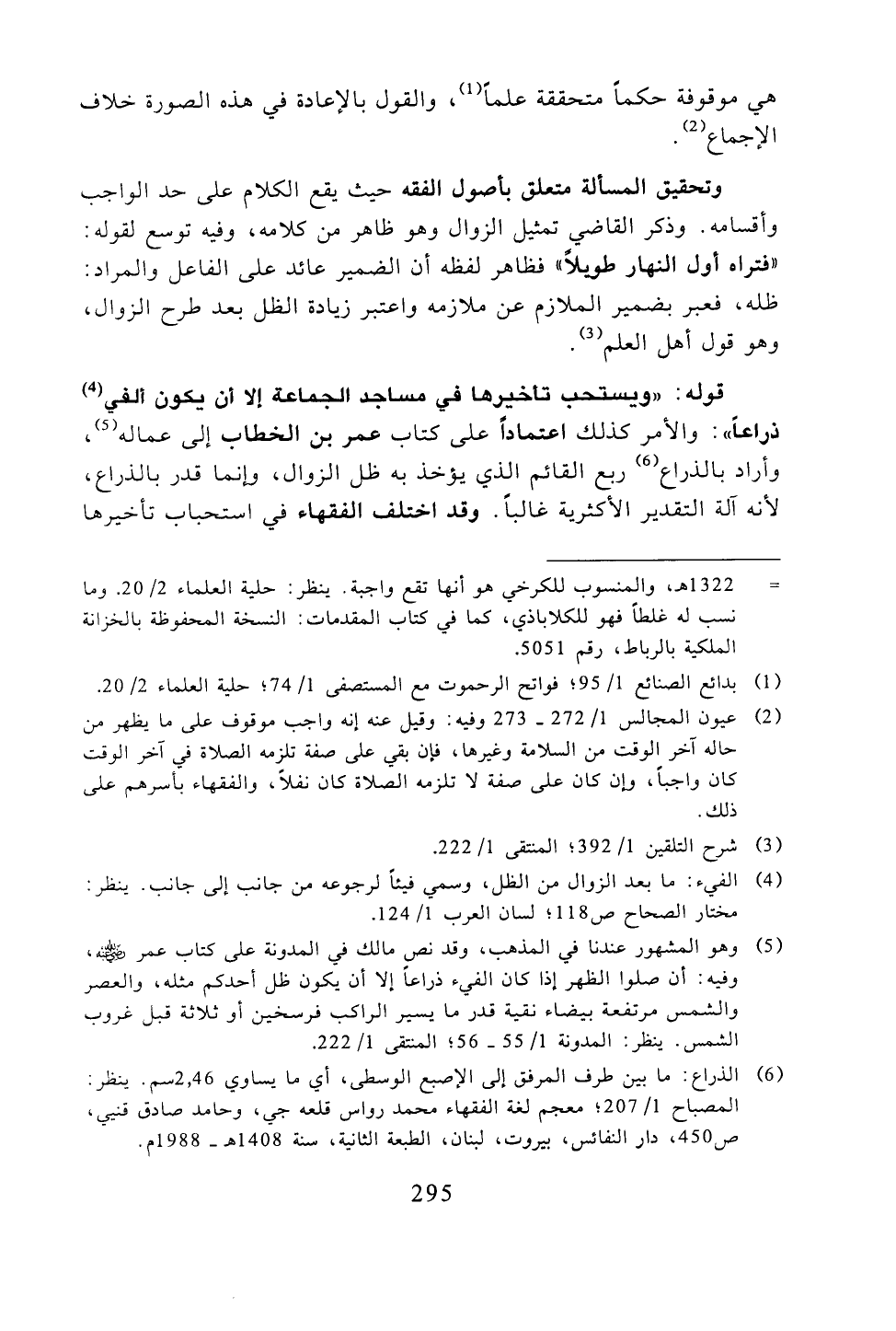 وتحقيق المسألة متعلق بأصول الفقه حيث يقع الكلام على حد الواجب وأقسامه. وذكر القاضي تمثيل الزوال وهو ظاهر من كلامه، وفيه توسع لقوله: "فتراه أول النهار طويلاً" فظاهر لفظه أن الضمير عائد على الفاعل والمراد: ظله، فعبر بضمير الملازم عن ملازمه واعتبر زيادة الظل بعد طرح الزوال، وهو قول أهل العلم.