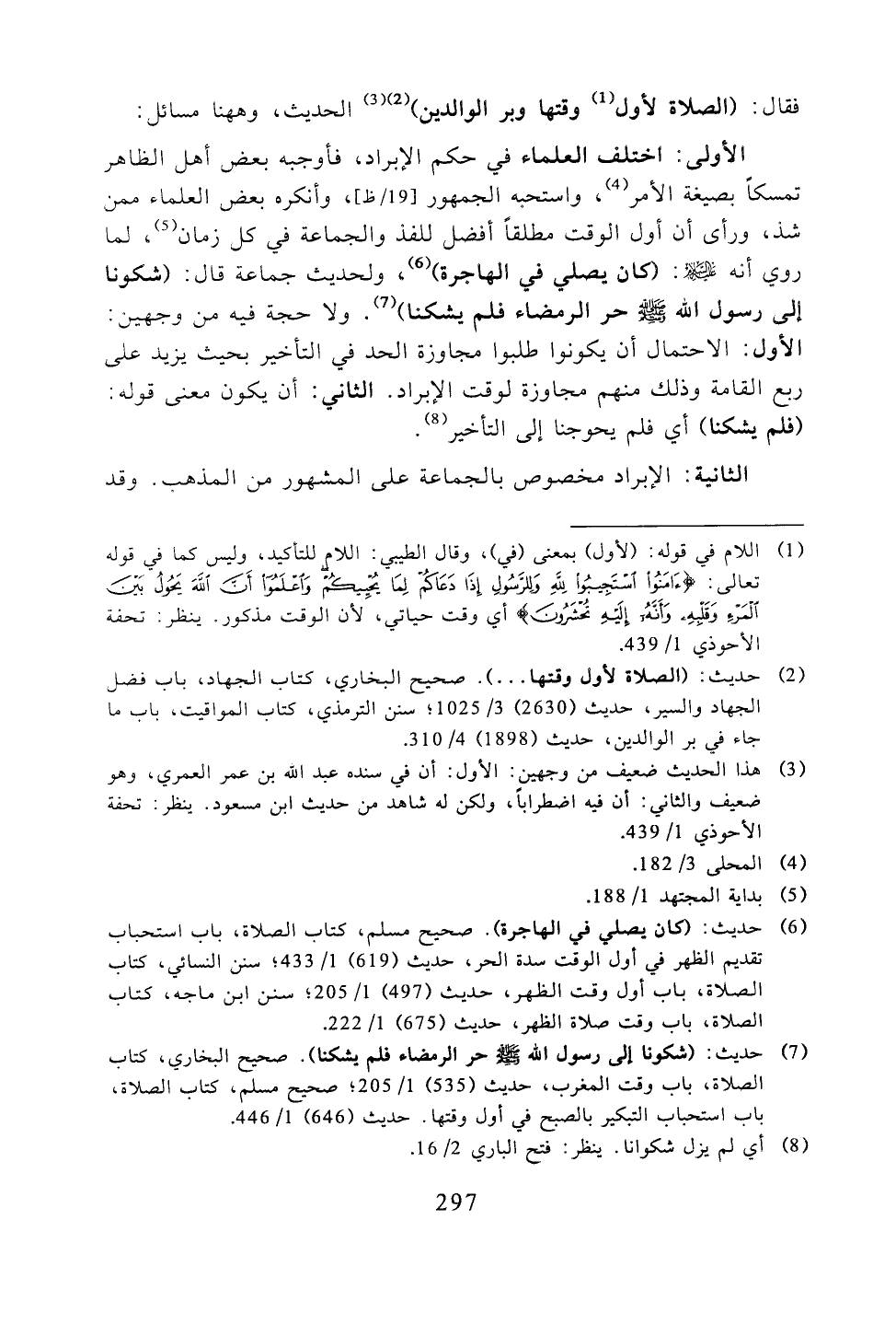الأولى: اختلف العلماء في حكم الإبراد، فأوجبه بعض أهل الظاهر تمسكًا بصيغة الأمر، واستحبه الجمهور، وأنكره بعض العلماء ممن شذ، ورأى أن أول الوقت مطلقًا أفضل للفذ والجماعة في كل زمان، لما روي أنه -عليه السلام -: (كان يصلي في الهاجرة)، ولحديث جماعة قال: (شكونا إلى رسول الله -صلى الله عليه وسلم -حر الرمضاء فلم يشكنا). ولا حجة فيه من وجهين: الأول: الاحتمال أن يكونوا طلبوا مجاوزة الحد في التأخير بحيث يزيد على ربع القامة وذلك منهم مجاوزة لوقت الإبراد. الثاني: أن يكون معنى قوله: (فلم يشكنا) أي فلم يحوجنا إلى التأخير.
