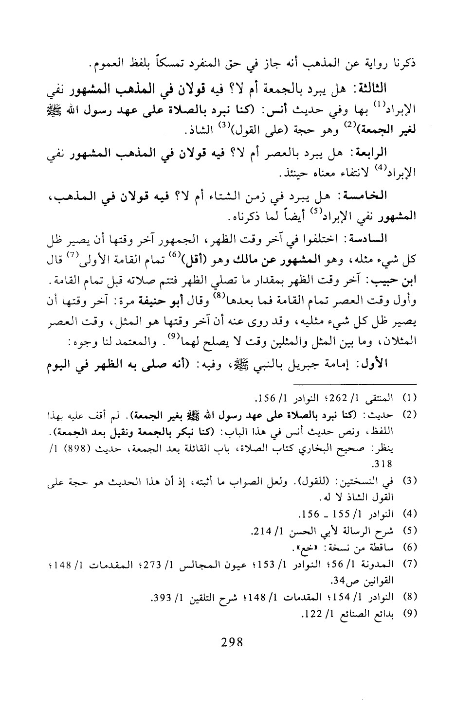 الثالثة: هل يبرد بالجمعة أم لا؟ فيه قولان في المذهب المشهور نفي الإبراد بها وفي حديث أنس: (كنا نبرد بالصلاة على عهد رسول الله -صلى الله عليه وسلم -لغير الجمعة) وهو حجة (على القول) الشاذ.