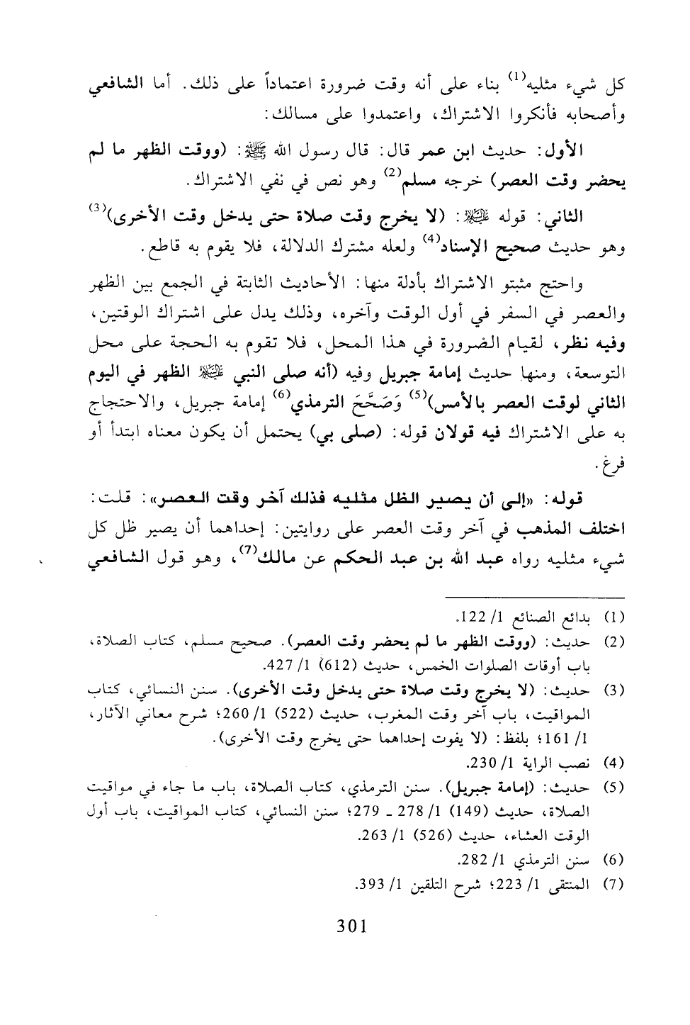 واحتج مثبتو الاشتراك بأدلة منها: الأحاديث الثابتة في الجمع بين الظهر والعصر في السفر في أول الوقت وآخره، وذلك يدل على اشتراك الوقتين، وفيه نظر، لقيام الضرورة في هذا المحل، فلا تقوم به الحجة على محل التوسعة، ومنها حديث إمامة جبريل وفيه (أنه صلى النبي -عليه السلام -الظهر في اليوم الثاني لوقت العصر بالأمس) وصحح الترمذي إمامة جبريل، والاحتجاج به على الاشتراك فيه قولان قوله: (صلى بي) يحتمل أن يكون معناه ابتدأ أو فرع.