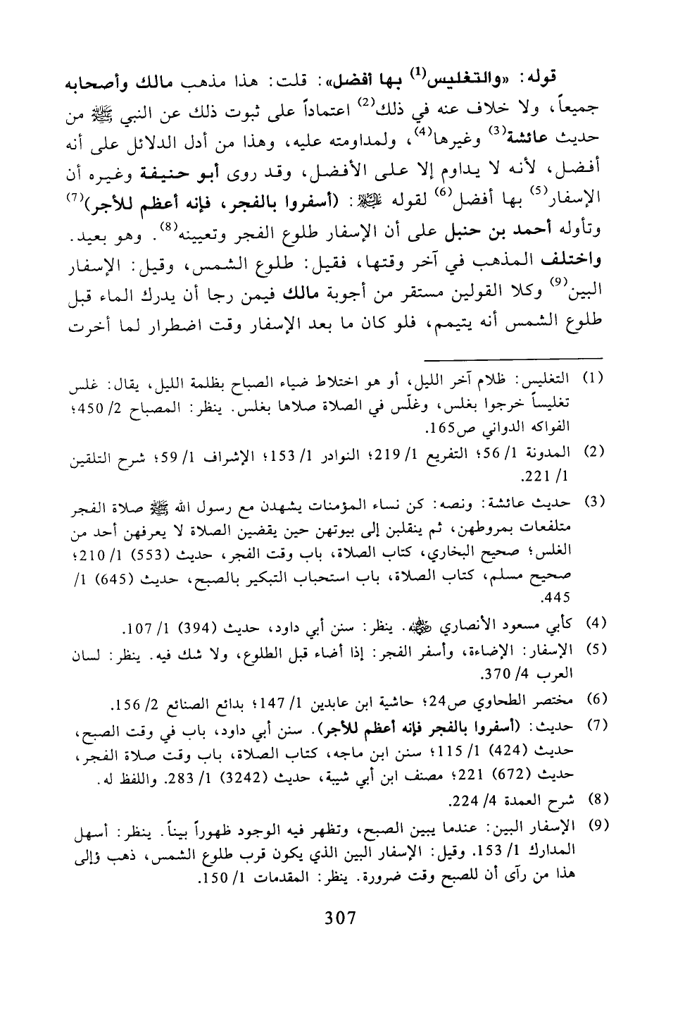 قوله: "والتغليس بها أفضل": قلت: هذا مذهب مالك وأصحابه جميعًا، ولا خلاف عنه ذلك اعتمادًا على ثبوت ذلك عن النبي -صلى الله عليه وسلم -من حديث عائشة وغيرها، ولمداومته عليه، وهذا من أدل الدلائل على أنه أفضل، لأنه لا يداوم إلا على الأفضل، وقد روى أبو حنيفة وغيره أن الإسفار بها أفضل لقوله -عليه السلام -: (أسفروا بالفجر، فإنه أعظم للأجر) وتأويله أحمد بن حنبل على أن الأسفار طلوع الفجر وتعيينه. وهو بعيد. واختلف المذهب في آخر وقتها، فقيل: طلوع الشمس، وقيل: الإسفار البين وكلا القولين مستقر من أجوبة مالك فيمن رجا أن يدرك الماء قبل طلوع الشمس أنه يتيمم، فلو كان ما بعد الإسفار وقت اضطرار لما أخرت