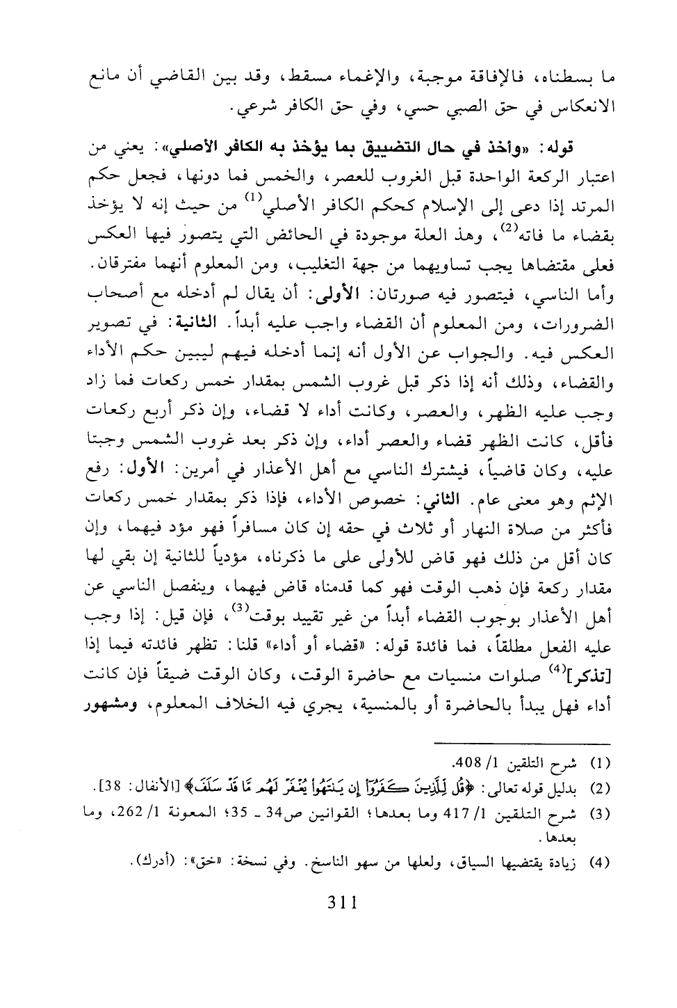 قوله: "وأخذ في حال التضييق بما يؤخذ به الكافر الأصلي": يعني من اعتبار الركعة الواحدة قبل الغروب للعصر، والخمس فما دونها، فجعل حكم المرتد إذا دعى إلى الإسلام كحكم الكافر الأصلي من حيث إنه لا يؤخذ بقضاء ما فاته، وهذه العلة موجودة في الحائض التي يتصور فيها العكس فعلى مقتضاها يجب تساويهما من جهة التغليب، ومن المعلوم أنهما مفترقان. وأما الناسي، فيتصور فيه صورتان: الأولى: أن يقال لم أدخله مع أصحاب الضرورات، ومن المعلوم أن القضاء واجب عليه أبدًا. الثانية: في تصوير العكس فيه. والجواب عن الأول أنه إنما أدخله فيهم ليبين حكم الأداء والقضاء، وذلك أنه إذا ذكر قبل غروب الشمس بمقدار خمس ركعات فما زاد وجب عليه الظهر، والعصر، وكانت أداء لا قضاء، وإن ذكر أربع ركعات فأقل، كانت الظهر قضاء والعصر أداء، وإن ذكر بعد غروب الشمس وجبتا عليه، وكان قاضيًا، فيشترك الناسي مع أهل الأعذار في أمرين: الأول: رفع الإثم وهو معنى عام الثاني: خصوص الأداء، فإذا ذكر بمقدار خمس ركعات فأكثر من صلاة النهار أو ثلاث في حقه إن كان مسافرًا فهو مؤد فيهما، وإن كان أقل من ذلك فهو قاض للأولى على ما ذكرناه، مؤديًا للثانية إن بقي لها مقدار ركعة فإن ذهب الوقت فهو كما قدمناه قاض فيهما، وينفصل الناسي عن أهل الأعذار بوجوب القضاء أبدًا من غير تقييد بوقت، فإن قيل: إذا وجب عليه الفعل مطلقًا، فما فائدة قوله: "قضاء أو أداء" قلنا: تظهر فائدته فيما إذا [تذكر] صلوات منسيات مع حاضرة الوقت، وكان الوقت ضيقًا فإن كانت أداء فهل يبدأ بالحاضرة أو بالمنسية، يجري فيه الخلاف المعلوم، ومشهور