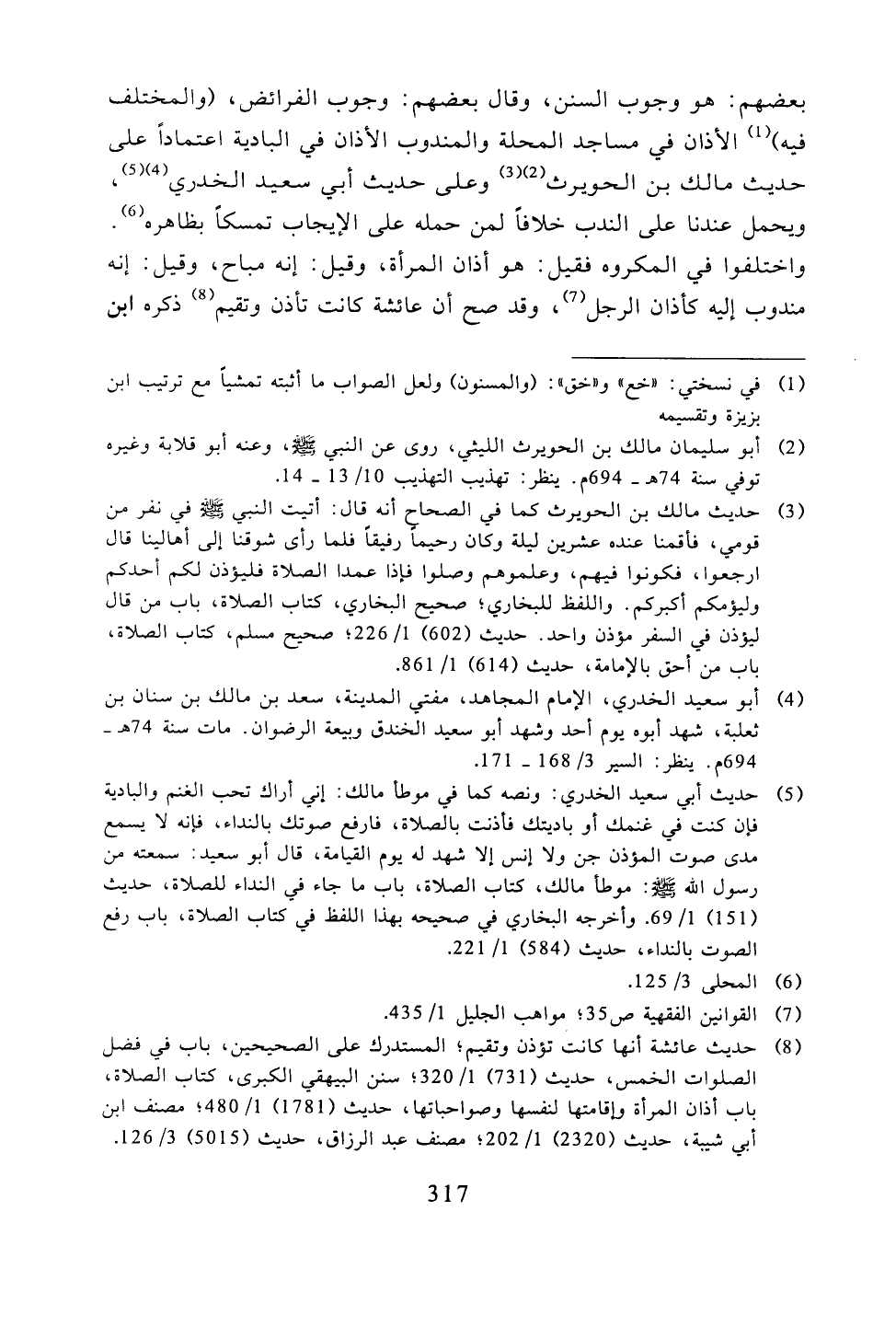 بعضهم: هو وجوب السنن، وقال بعضهم: وجوب الفرائض، (والمختلف فيه) الأذان في مساجد المحلة ولمندوب الأذان في البادية اعتمادًا على حديث مالك بن الحويرث وعلى حديث أبي سعيد الخدري، ويحمل عندنا على الندب خلافًا لمن حمله على الإيجاب تمسكًا بظاهره. واختلفوا في المكروه فقيل: هو أذان المرأة، وقيل: إنه مباح، وقيل: إنه مندوب إليه كأذان الرجل، وقد صح أن عائشة كانت تأذن وتقيم ذكره ابن