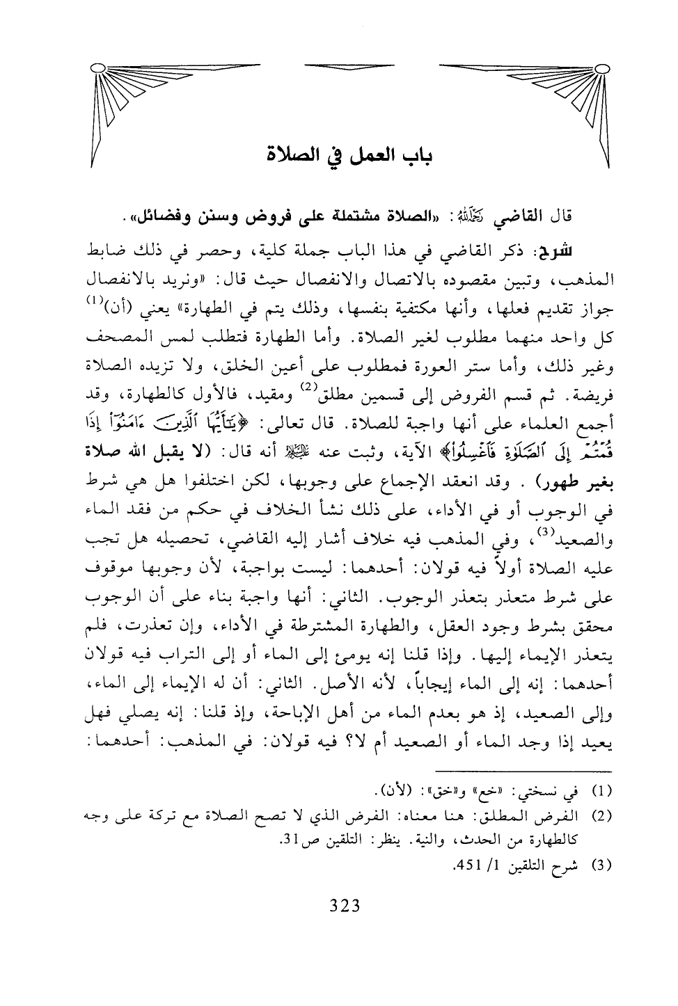 شرح: ذكر القاضي في هذا الباب جملة كلية، وحصر في ذلك ضابط المذهب، وتبين مقصوده بالاتصال والانفصال حيث قال: ((ونريد بالانفصال جواز تقديم فعلها، وأنها مكتفية بنفسها، وذلك يتم في الطهارة)) يعني (أن) كل واحد منهما مطلوب لغير الصلاة. وأما الطهارة فتطلب لمس المصحف وغير ذلك، وأما ستر العورة فمطلوب على أعين الخلق، ولا تزيده الصلاة فريضة. ثم قسم الفروض إلى قسمين مطلق ومقيد، فالأول كالطهارة، وقد أجمع العلماء على أنها واجبة للصلاة. قال تعالى: {ياأيها الذين ءامنوا إذا قمتم إلى الصلاة فاغتسلوا} الآية، وثبت عنه -عليه السلام- أنه قال: (لا يقبل الله صلاة بغير طهور). وقد انعقد الإجماع على وجوبها، لكن اختلفوا هل هي شرط في الوجوب أو في الأداء، على ذلك نشأ الخلاف في حكم من فقد الماء والصعيد، وفي المذهب فيه خلاف أشار إليه القاضي، تحصيله هل تجب عليه الصلاة أولاً فيه قولان: أحدهما: ليست بواجبة، لأن وجوبها موقوف على شرط متعذر بتعذر الوجوب. الثاني: أنها واجبة بناء على أن الوجوب محقق بشرط وجوب العقل، والطهارة المشترطة في الأداء، وإن تعذرت، فلم يتعذر الإيماء إليها. وإذا قلنا إنه يومئ إلى الماء أو إلى التراب فيه قولان أحدهما: إنه إلى الماء إيجابًا، لأنه الأصل. الثاني: أن له الإيماء إلى الماء، وإلى الصعيد، إذ هو بعدم الماء من أهل الإباحة، وإذ قلنا: إنه يصلي فهل يعيد إذا وجد الماء أو الصعيد أم لا؟ فيه قولان: في المذهب: أحدهما: