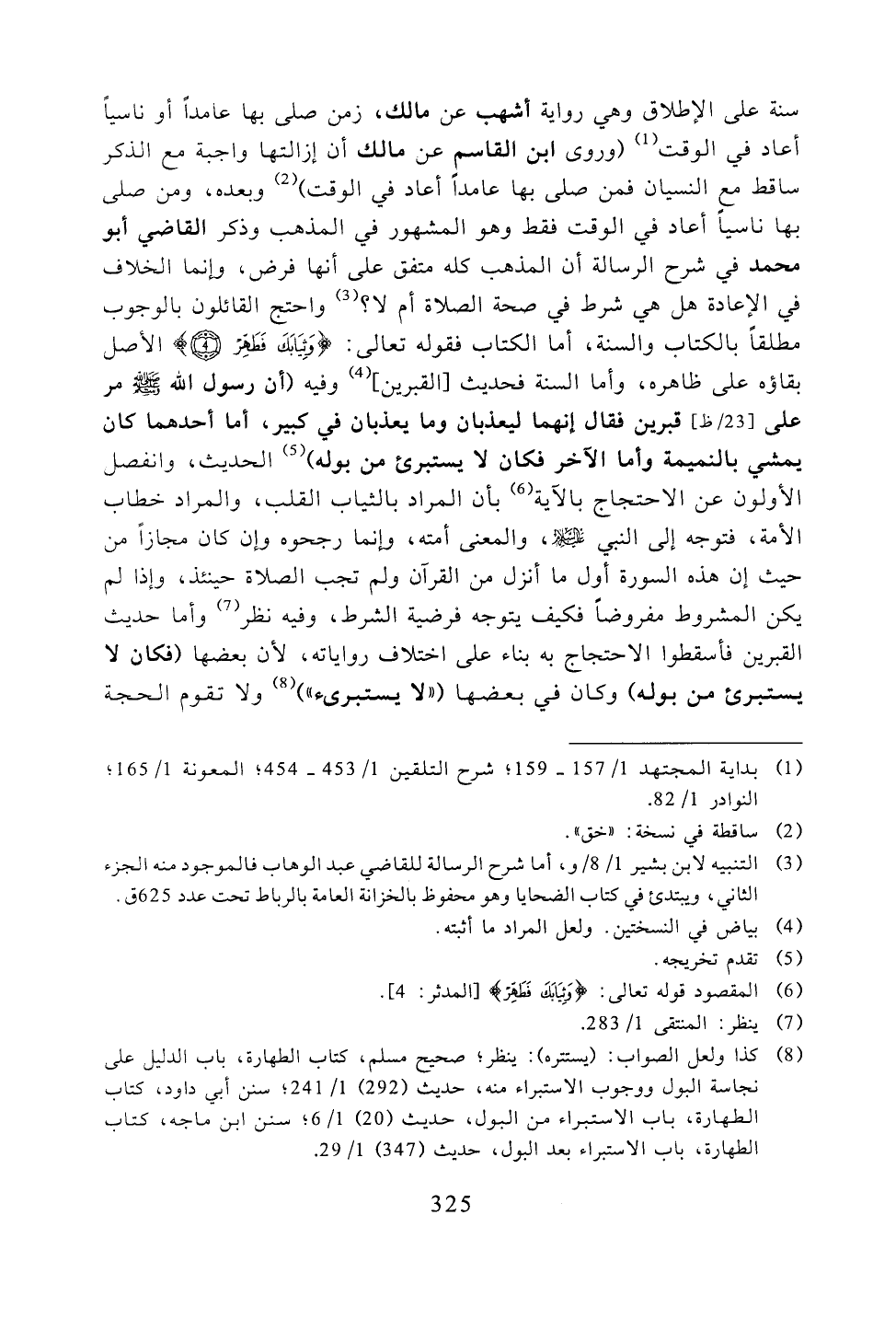 سنة على الإطلاق وهي رواية أشهب عن مالك، زمن صلى بها عامدًا أو ناسيًا أعاد في الوقت (وروى ابن القاسم عن مالك أن إزالتها واجبة مع الذكر ساقط مع النسيان فمن صلى بها عامدًا أعاد في الوقت) وبعده، ومن صلى بها ناسيًا أعاد في الوقت فقط وهو المشهور في المذهب وذكر القاضي أبو محمد في شرح الرسالة أن المذهب كله متفق على أنها فرض، وإنما الخلاف في الإعادة هل هي شرط في صحة الصلاة أم لا؟ واحتج القائلون بالوجوب مطلقًا بالكتاب والسنة، أما الكتاب فقوله تعالى: {وثيابك فطهر} الأصل بقاؤه على ظاهره، أما السنة فحديث [القبرين] وفيه (أن رسول الله -صلى الله عليه وسلم- مر على قبرين فقال إنهما ليعذبان وما يعذبان في كبير، أما أحدهما كان يمشي بالنميمة وأما الآخر فكان لا يستبرئ من بوله) الحديث، وانفصل الأولون عن الاحتجاج بالآية بأن المراد بالثياب القلب، والمراد خطاب الأمة، فتوجه إلى النبي -عليه السلام-، والمعنى أمته، وإنما رجحوه وإن كان مجازًا من حيث إن هذه السورة أول ما أنزل من القرآن ولم تجب الصلاة حينئذ، وإذا لم يكن المشروط مفروضًا فكيف يتوجه فرضية الشرط، وفيه نظر وأما حديث القبرين فأسقطوا الاحتجاج به بناء على اختلاف رواياته، لأن بعضها (فكان لا يستبرئ من بوله) وكان في بعضها (((لا يستبرئ))) ولا تقوم الحجة