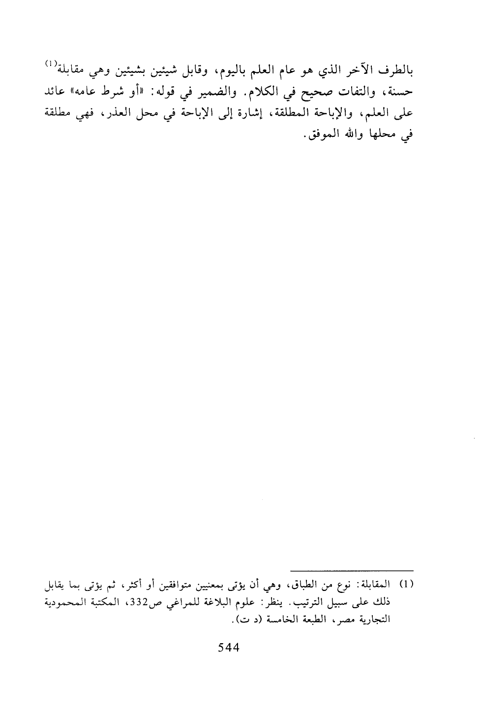بالطرف الآخر الذي هو عام العلم باليوم، وقابل شيئين بشيئين وهي مقابلة حسنة، والتفات صحيح في الكلام. والضمير في قوله: "أو شرط عامه" عائد على العلم، والإباحة المطلقة، إشارة إلى الإباحة في محل العذر، فهي مطلقة في محلها والله الموفق.