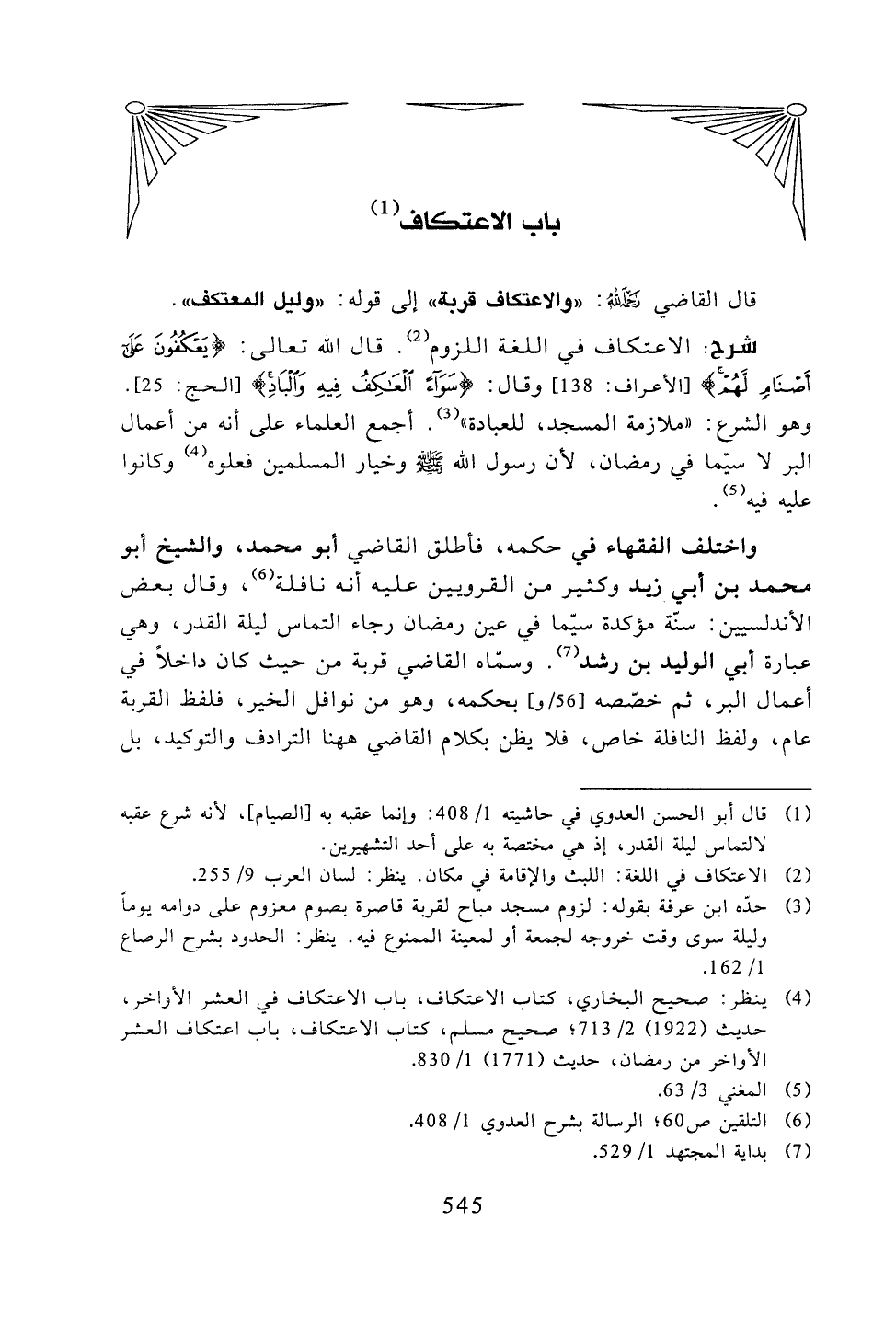 شرح: الاعتكاف في اللغة اللزوم. قال الله تعالى: {يعكفون على أصنام لهم} [الأعراف: 138] وقال: {سواءً العاكف فيه والباد} [الحج: 25]. وهو الشرع: "ملازمة المسجد، للعبادة". أجمع العلماء على أنه من أعمال البر لا سيما في رمضان، لأن رسول الله -صلى الله عليه وسلم- وخيار المسلمين فعلوه وكانوا عليه فيه.