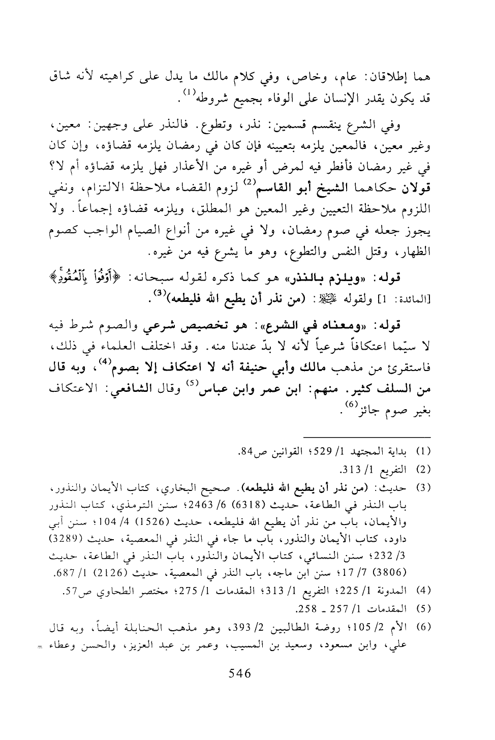 هما إطلاقان: عام، وخاص، وفي كلام مالك ما يدل على كراهيته لأنه شاق قد يكون يقدر الإنسان على الوفاء بجميع شروطه.