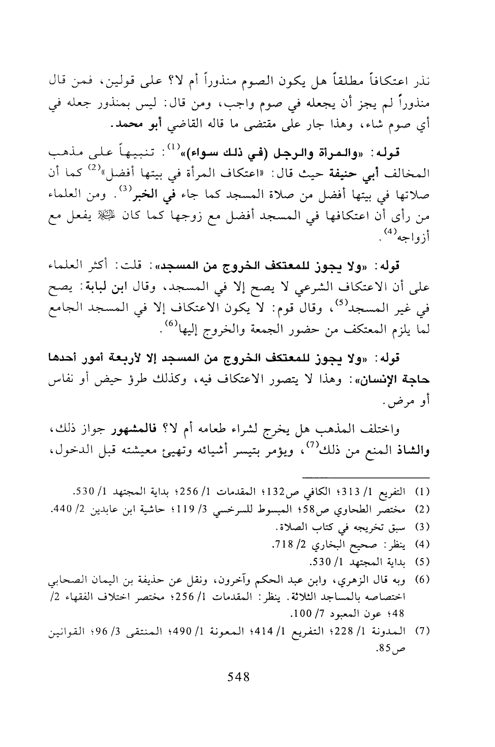 قوله: "ولا يجوز للمعتكف الخروج من المسجد إلا لأربعة أمور أحدها حاجة الإنسان": وهذا لا يتصور الاعتكاف فيه، وكذلك طرؤ حيض أو نفاس أو مرض.
