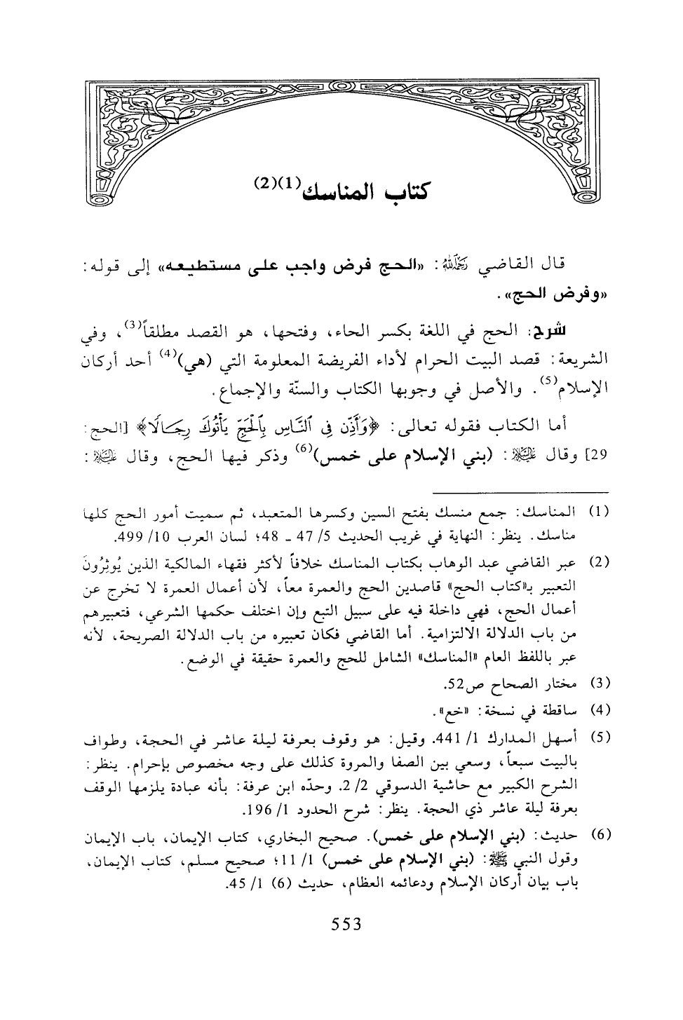شرح: الحج في اللغة بكسر الحاء، وفتحها، هو القصد مطلقًا، وفي الشريعة: قصد البيت الحرام لأداء الفريضة المعلومة التي (هي) أحد أركان الإسلام. والأصل في وجوبها الكتاب والسنة والإجماع.