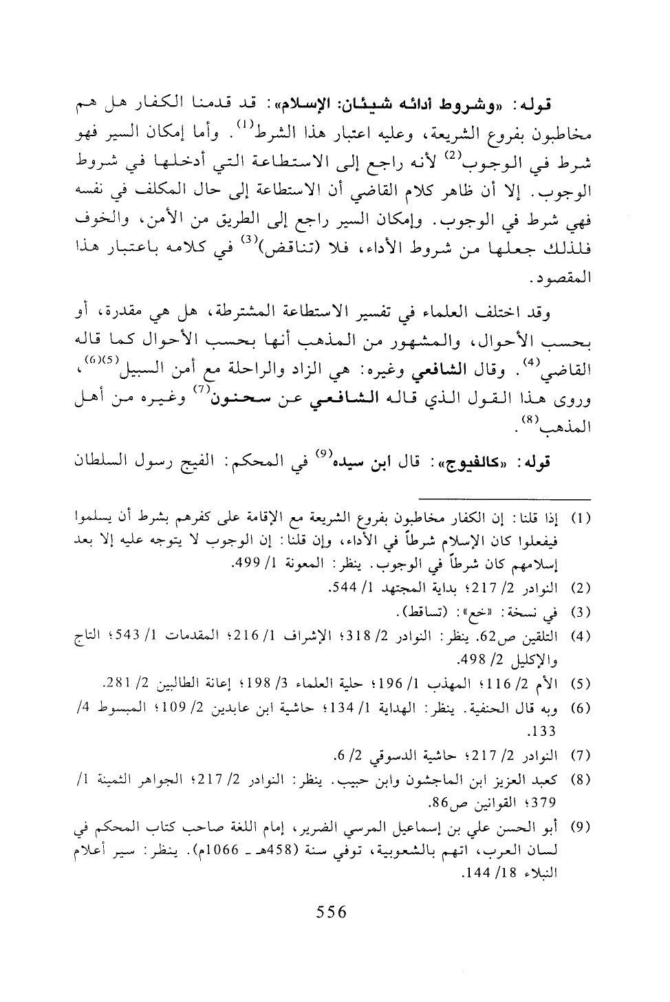 قوله: "وشروط أدائه شيئان: الإسلام": قد قدمنا الكفار هل هم مخاطبون بفروع الشريعة، وعليه اعتبار هذا الشرط. وأما إمكان السير فهو شرط في الوجوب لأنه راجع إلى الاستطاعة التي أدخلها في شروط الوجوب. إلا أن ظاهر كلام القاضي أن الاستطاعة إلى حال المكلف في نفسه فهي شرط في الوجوب. وإمكان السير راجع إلى الطريق من الأمن، والخوف فلذلك جعلها من شروط الأداء، فلا (تناقض) في كلامه باعتبار هذا المقصود.