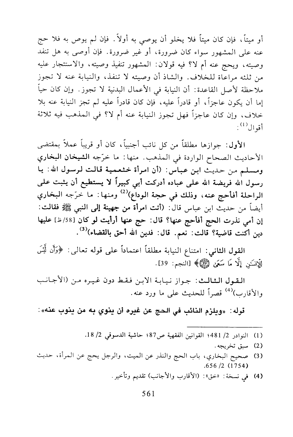 الأول: جوازها مطلقًا من كل نائب أجنبيًا، كان أو قريبًا عملًا بمقتضى الأحاديث الصحاح الواردة في المذهب. منها: ما خرجه الشيخان البخاري ومسلم من حديث ابن عباس: (أن امرأة خثعمية قالت لرسول الله: يا رسول الله فريضة الله على عباده أدركت أبي كبيرًا لا يستطيع أن يثبت على الراحلة أفأحج عنه، وذلك في حجة الواداع) ومنها: ما خرجه البخاري أيضًا من حديث ابن عباس قالت: (أتت امرأة من جهينة إلى النبي -صلى الله عليه وسلم- فقالت: إن أمي نذرت الحج أفأحج عنها؟ قال: حج عنها أرأيت لو كان عليها دين أكنت قاضية؟ قالت: نعم. قال: فدين الله أحق بالقضاء).