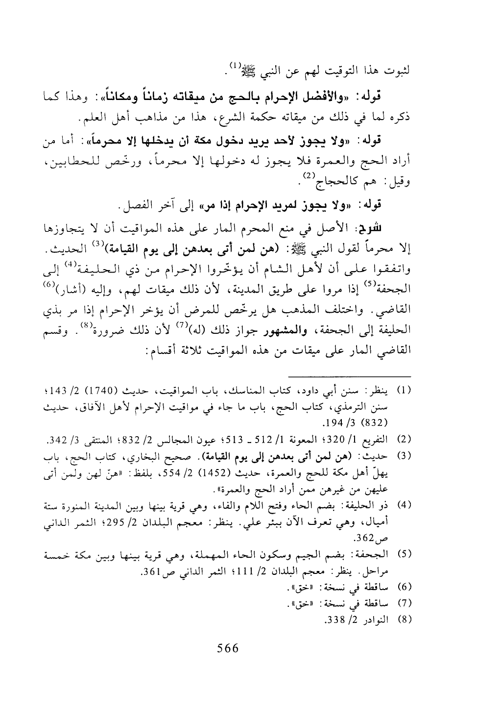 شرح: الأصل في منع المحرم المار على هذه المواقيت أن لا يتجاوزها إلا محرمًا لقول النبي -صلى الله عليه وسلم-: (هل لمن أتى بعدهن إلى يوم القيامة) الحديث. واتفقوا على أن لأهل الشام أن يؤخروا الإحرام من ذي الحليفة إلى الجحفة إذا مروا على طريق المدينة، لأن ذلك ميقات لهم، وإليه (أشار) القاضي. واختلف المذهب هل يرخص للمرض أن يؤخر الإحرام إذا مر بذي الحليفة إلى الجحفة، والمشهور جواز ذلك (له) لأن ذلك ضرورة. وقسم القاضي المار على ميقات من هذه المواقيت ثلاثة أقسام: