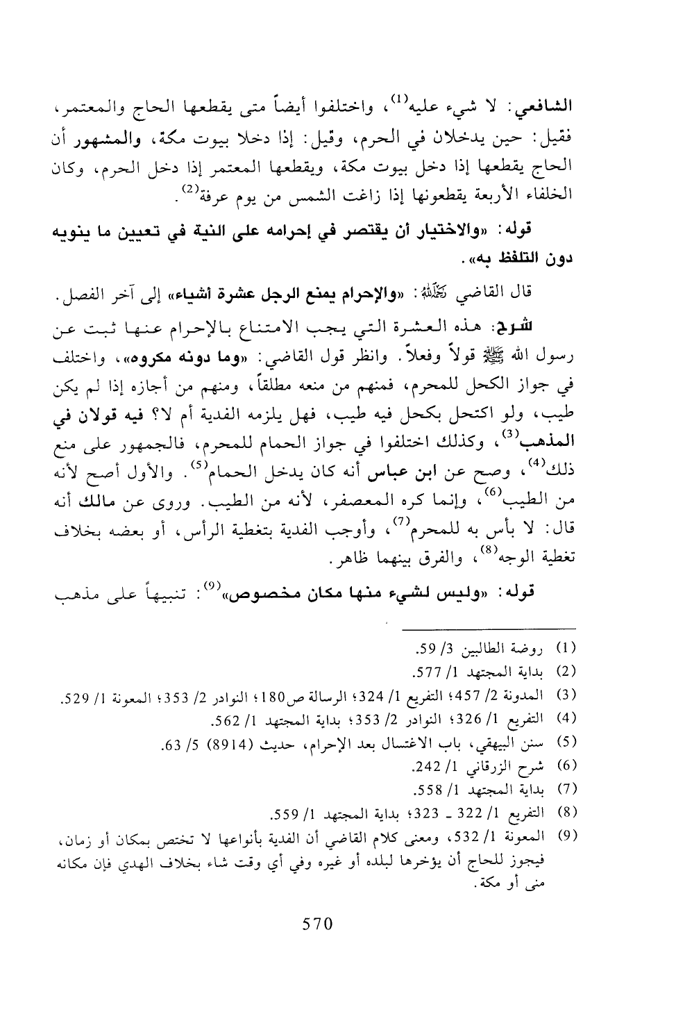 شرح: هذه العشرة التي يجب الامتناع بالإحرام عنها ثبت عن رسول الله -صلى الله عليه وسلم- قولًا وفعلًا. وانظر قول القاضي: "وما دونه مكروه"، واختلف في جواز الكحل للمحرم، فمنهم من منعه مطلقًا، ومنهم من أجازه إذا لم يكن طيب، ولو اكتحل بكحل فيه طيب، فهل يلزمه الفدية أم لا؟ فيه قولان في المذهب، وكذلك اختلفوا في جواز الحمام للمحرم، فالجمهور على منع ذلك، وصح عن ابن عباس أنه كان يدخل الحمام. والأول أصح لأنه من الطيب، وإنما كره المعصفر، لأنه من الطيب. وروى عن مالك أنه قال: لا بأس به للمحرم، وأوجب الفدية بتغطية الرأس، أو بعضه بخلاف تغطية الوجه، والفرق بينهما ظاهر.