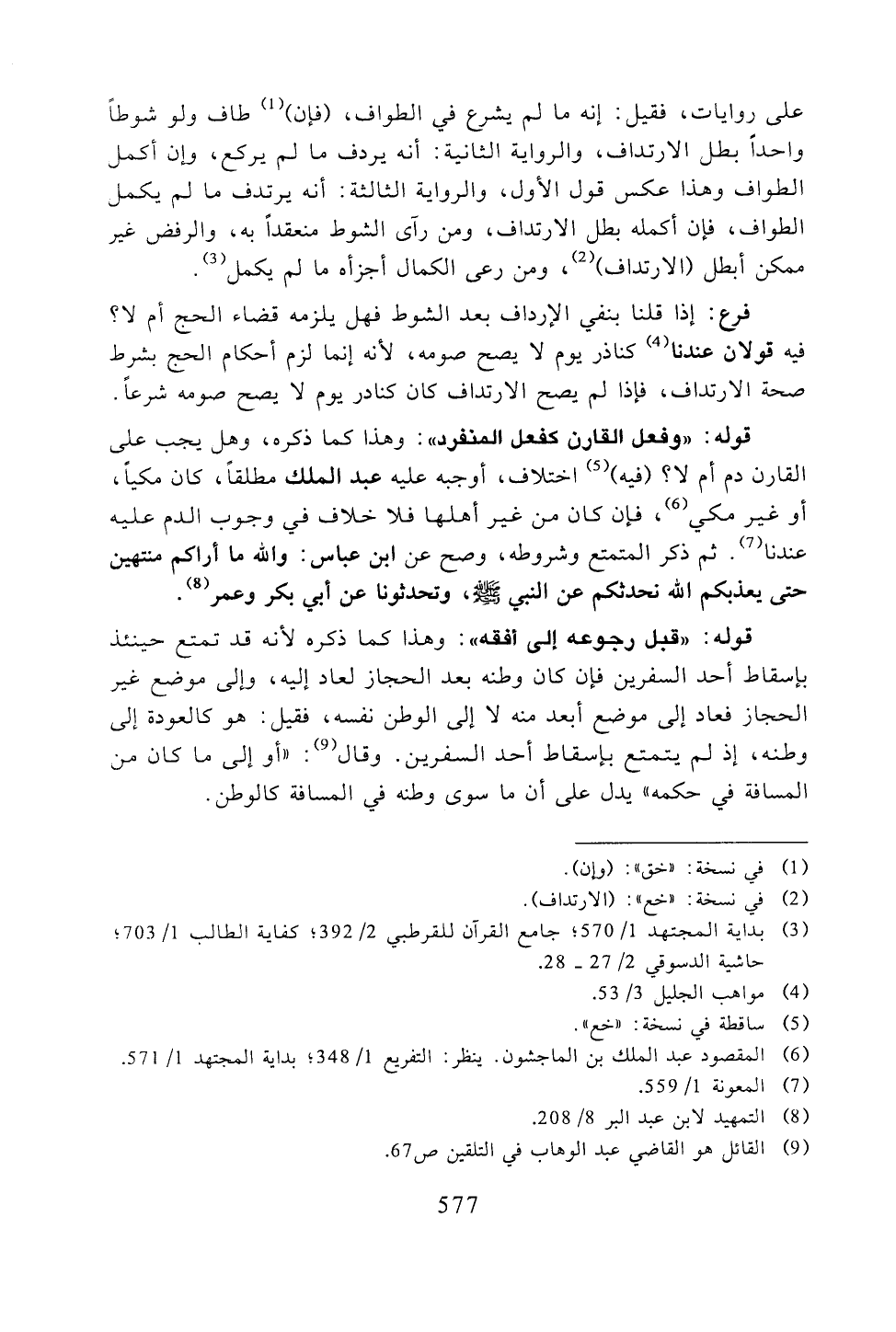 قوله: "قبل رجوعه إلى أفقه": وهذا كما ذكره لأنه قد تمتع حينئذ بإسقاط أحد السفرين فإن كان وطنه بعد الحجاز لعاد إليه، وإلى موضع غير الحجاز فعاد إلى موضع أبعد منه لا إلى الوطن نفسه، فقيل: هو كالعودة إلى وطنه، إذ لم يتمتع بإسقاط أحد السفرين. وقال: "أو إلى ما كان من المسافة في حكمه" يدل على أن ما سوى وطنه في المسافة كالوطن.