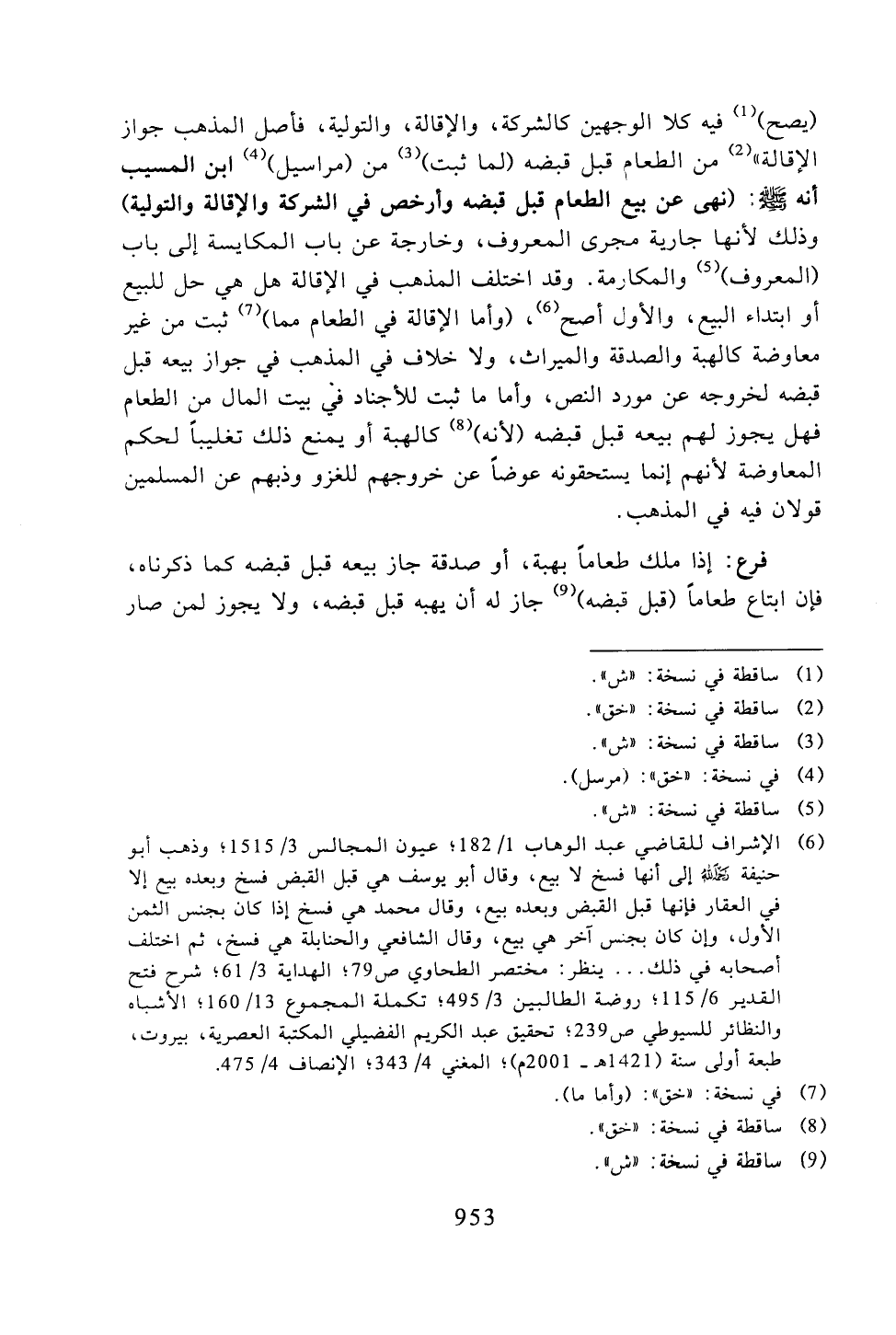 (يصح) فيه كلا الوجهين كالشركة، والإقالة، والتولية، فأصل المذهب جواز الإقالة» من الطعام قبل قبضه (لما ثبت) من (مراسيل) ابن المسيب أنه -صلى الله عليه وسلم-: (نهى عن بيع الطعام قبل قبضه وأرخص في الشركة والإقالة والتولية) وذلك لأنها جارية مجرى المعروف، وخارجة عن باب المكايسة إلى باب (المعروف) والمكارمة. وقد اختلف المذهب في الإقالة هل هي حل للبيع أو ابتداء البيع، والأول أصح، (وأما الإقالة في الطعام مما) ثبت من غير معاوضة كالهبة والصدقة والميراث، ولا خلاف في المذهب في جواز بيعه قبل قبضه لخروجه عن مورد النص، وأما ما ثبت للأجناد في بيت المال من الطعام فهل يجوز لهم بيعه قبل قبضه (لأنه) كالهبة أو يمنع ذلك تغليبًا لحكم المعاوضة لأنهم إنما يستحقونه عوضًا عن خروجهم للغزو وذبهم عن المسلمين قولان فيه في المذهب.