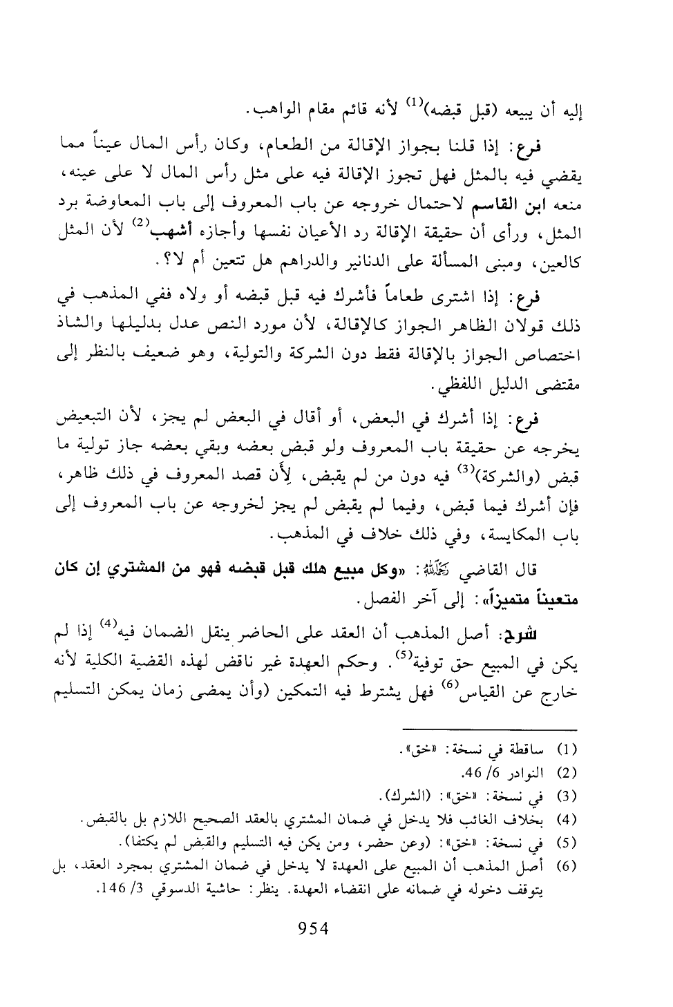 فرع: إذا أشرك في البعض، أو أقال في البعض لم يجز، لأن التبعيض يخرجه عن حقيقة باب المعروف ولو قبض بعضه وبقي بعضه جاز تولية ما قبض (والشركة) فيه دون من لم يقبض، لأن قصد المعروف في ذلك ظاهر، فإن أشرك فيما قبضه، وفيما لم يقبض لم يجز لخروجه عن باب المعروف إلى باب المكايسة، وفي ذلك خلاف في المذهب.