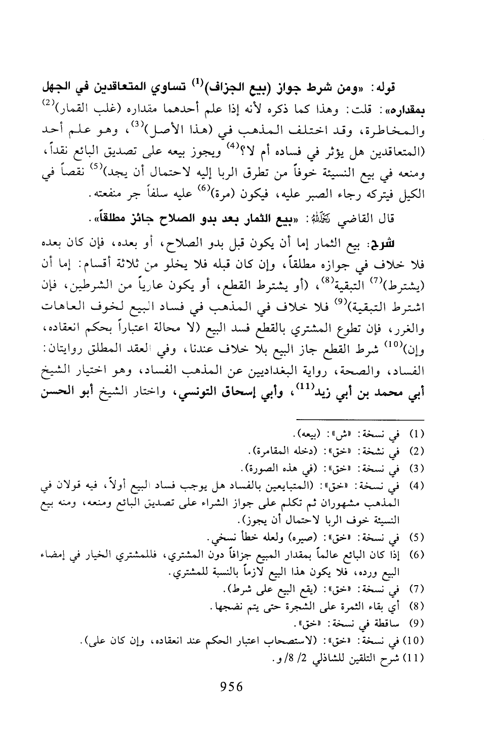 شرح: بيع الثمار إما أن يكون قبل بدو الصلاح، أو بعده، فإن كان بعده فلا خلاف في جوازه مطلقًا، وإن كان قبله فلا يخلو من ثلاثة أقسام: إما أن (يشترط) التبقية، (أو يشترط القطع، أو يكون عاريًا من الشرطين، فإن اشترط التبقية) فلا خلاف في المذهب في فساد البيع لخوف العاهات والغرر، فإن تطوع المشتري بالقطع فسد البيع (لا محالة اعتبارًا بحكم انعقاده، وإن) شرط القطع جاز البيع بلا خلاف عندنا، وفي العقد المطلق روايتان: الفساد، والصحة، رواية البغداديين عن المذهب الفساد، وهو اختيار الشيخ أبي محمد بن أبي زيد، وأبي إسحاق التونسي، واختار الشيخ أبو الحسن