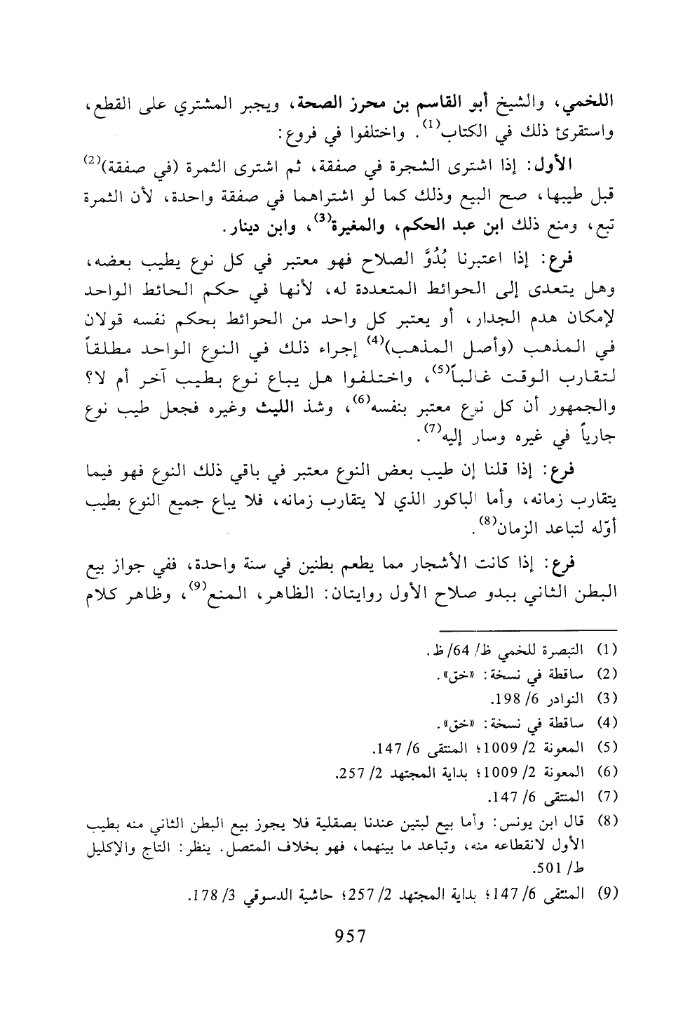 اللخمي، والشيخ أبو القاسم بن محرز الصحة، ويجبر المشتري على القطع، واستقرئ ذلك في الكتاب. وأختلفوا في فروع: