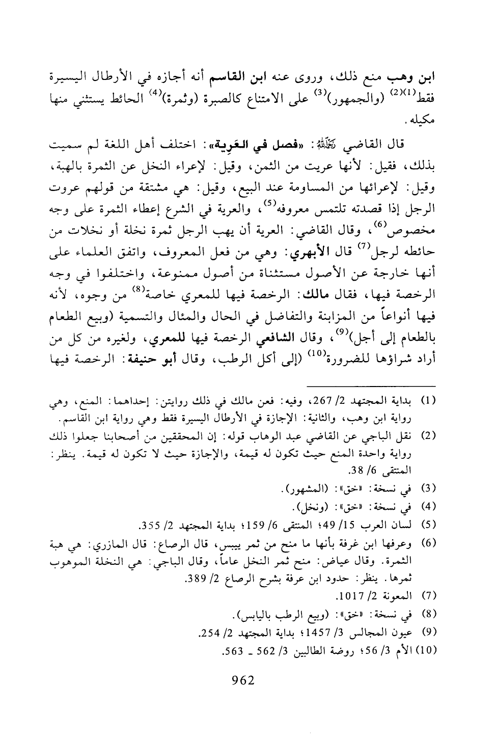 قال القاضي رحمه الله: "فصل في العرية": اختلف أهل اللغة لم سميت بذلك، فقيل: لأنها عريت من الثمن، وقيل: لإعراء النخل عن الثمرة بالهبة، وقيل: لإعرائها من المساومة عند البيع، وقيل: هي مشتقة من قولهم عروت الرجل إذا قصدته تلتمس معروفه، والعرية في الشرع إعطاء الثمرة على وجه مخصوص، وقال القاضي: العرية أن يهب الرجل ثمرة نخله أو نخلات من حائطه لرجل قال الأبهري: وهي من فعل المعروف، واتفق العلماء على أنها خارجة عن الأصول مستثناة من أصول ممنوعة، واختلفوا في وجه الرخصة فيها، فقال مالك: الرخصة فيها للمعري خاصة من وجوه، لأنه فيها أنواعًا من المزابنة والتفاضل في الحال والمئال والتسمية (وبيع الطعام بالطعام إلى أجل)، وقال الشافعي الرخصة فيها للمعري، ولغيره من كل من أراد شراؤها للضرورة (إلى أكل الرطب، وقال أبو حنيفة: الرخصة فيها