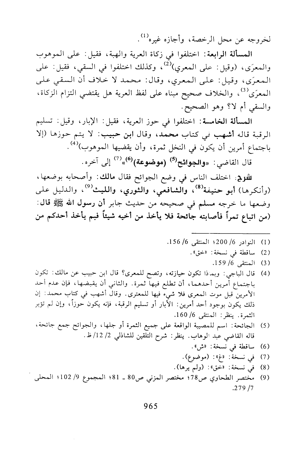 المسألة الرابعة: اختلفوا في زكاة العرية والهبة، فقيل: على الموهوب والمعرى، (وقيل: على المعري)، وكذلك اختلفوا في السقي، فقيل: على المعرى، وقيل: على المعري، وقال: محمد لا خلاف أن السقي على المعرى، والخلاف صحيح مبناه على لفظ العرية هل يقتضي التزام الزكاة، والسقي أم لا؟ وهو الصحيح.