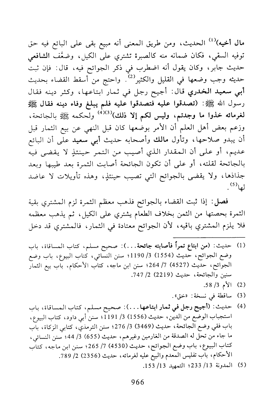مال أخيه) الحديث، ومن طريق المعنى أنه مبيع بقى على البائع فيه حق توفيه السقي، فكان ضمانه منه كالصبرة تشتري على الكيل، وضعف الشافعي حديث جابر، وكان يقول أنه اضطرب في ذكر الجوائح فيه، قال: فإن ثبت حديثه وجب وضعها في القليل والكثير. واحتج من أسقط القضاء بحديث أبي سعيد الخدري قال: أجيح رجل في ثمار ابتاعها، وكثر دينه فقال رسول الله صلى الله عليه وسلم: (تصدقوا عليه فتصدقوا عليه فلم يبلغ وفاء دينه فقال صلى الله عليه وسلم لغرمائه خذوا ما وجدتم، وليس لكم إلا ذلك) ولحكمه صلى الله عليه وسلم بالجائحة، وزعم بعض أهل العلم أن الأمر بوضعها كان قبل النهي عن بيع الثمار قبل أن يبدو صلاحها، وتأول مالك وأصحابه حديث أبي سعيد على أن البائع عديم، أو على أن المقدار الذي أصيب من التمر حينئذ لا يقضى فيه بالجائحة لقلته، أو على أن تكون الجائحة أصابت الثمرة بعد طيبها وبعد جذاذها، ولا يقضى بالجوائح التي تصيب حينئذ، وهذه تأويلات لا عاضد لها.
