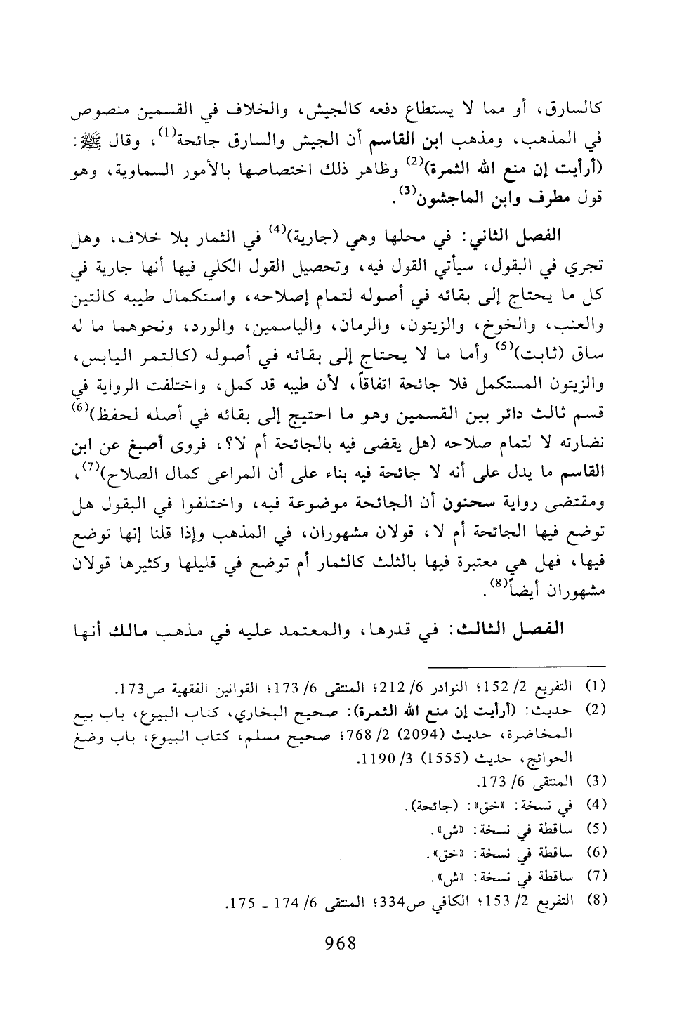 الفصل الثاني: في محلها وهي (جارية) في الثمار بلا خلاف، وهل تجري في البقول، سيأتي القول فيه، وتحصيل القول الكلي فيها أنها جارية في كل ما يحتاج إلى بقائه في أصوله لتمام إصلاحه، واستكمال طيبه كالتين والعنب، والخوخ، والزيتون، والرمان، والياسمين، والورد، ونحوهما ما له ساق (ثابت) وأما ما لا يحتاج إلى بقائه في أًوله (كالتمر اليابس، والزيتون المستكمل فلا جائحة اتفاقًا، لأن طيبه قد كمل، واختلف الرواية في قسم ثالث دائر بين القسمين وهو ما احتيج إلى بقائه في أصله لحفظ) نضارته لا لتمام صلاحه (هل يقضى فيه بالجائحة أم لا؟، فروى أصبغ عن ابن القاسم ما يدل على أنه لا جائحة فيه بناء على أن المراعى كمال الصلاح)، ومقتضى رواية سحنون أن الجائحة موضوعة فيه، واختلفوا في البقول هل توضع فيها الجائحة أم لا، قولان مشهوران، في المذهب وإذا قلنا إنها توضع فيها، فهل هي معتبرة فيها بالثلث كالثمار أم توضع في قليلها وكثيرها قولان مشهوران أيضًا.