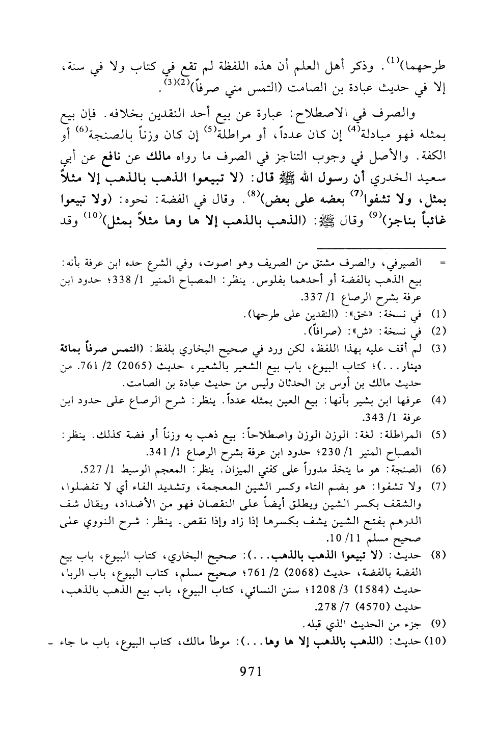 طرحهما). وذكر أهل العلم أن هذه اللفظة لم تقع في كتاب ولا في سنة، إلا في حديث عبادة بن الصامت (التمس مني صرفًا).