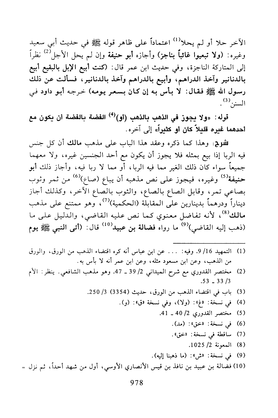 الآخر حلا أو لم يحلا اعتمادًا على ظاهر قوله صلى الله عليه وسلم في حديث أبي سعيد وغيره: (ولا تبيعوا غائبًا بناجز) وأجازه أبو حنيفة وإن لم يحل الأجل نظرًا إلى المتاركة الناجزة، وفي حديث ابن عمر قال: (كنت أبيع الإبل بالبقيع أبيع بالدنانير وآخذ بالدراهم وأخذ الدنانير وآخذ الدراهم، وأبيع بالدراهم وآخذ بالدنانير، فسألت عن ذلك رسول الله صلى الله عليه وسلم فقال: لا بأس به إن كان بسعر يومه) خرجه أبو داود في السنن.